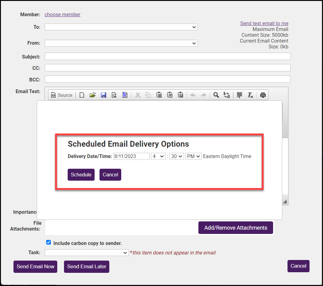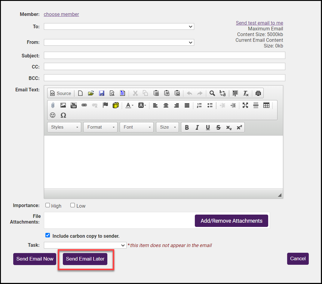 In the Send Email window, select the Send Email Later button.