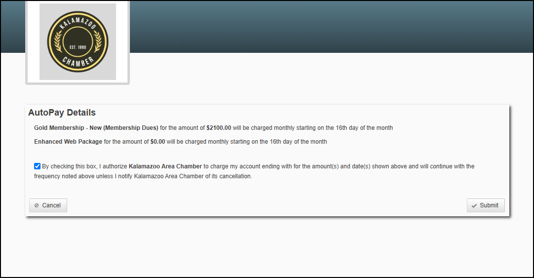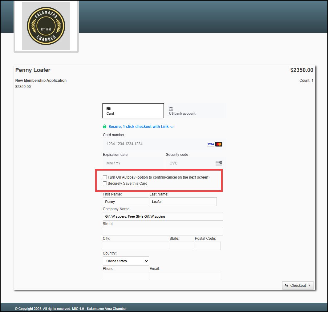 - After selecting Checkout, the applicant will see the Autopay Details screen, allowing confirmation that their credit card may be charged for future membership dues.