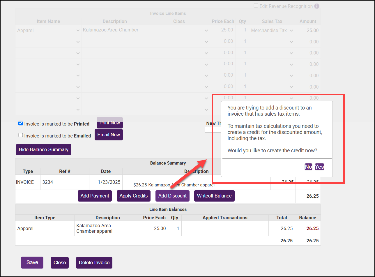 If you wish to add a discount to an invoice that includes sales tax, you must create a credit and then apply the credit to the invoice.
