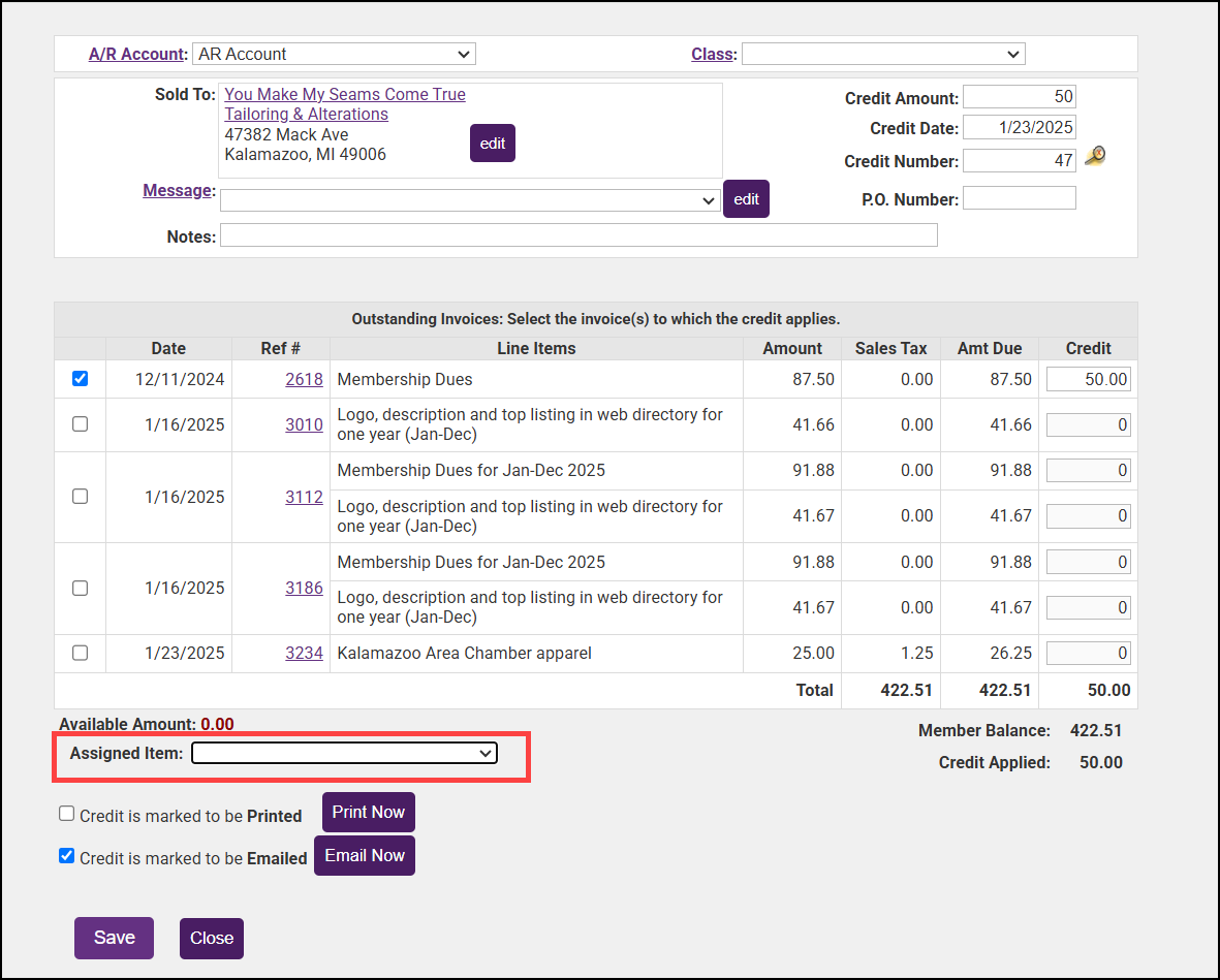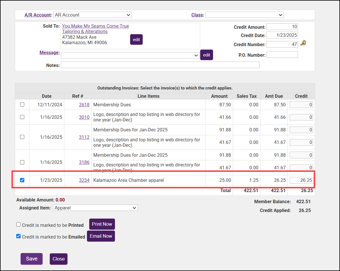 - If the member has multiple open invoices, select the invoice to which you wish to apply the credit.