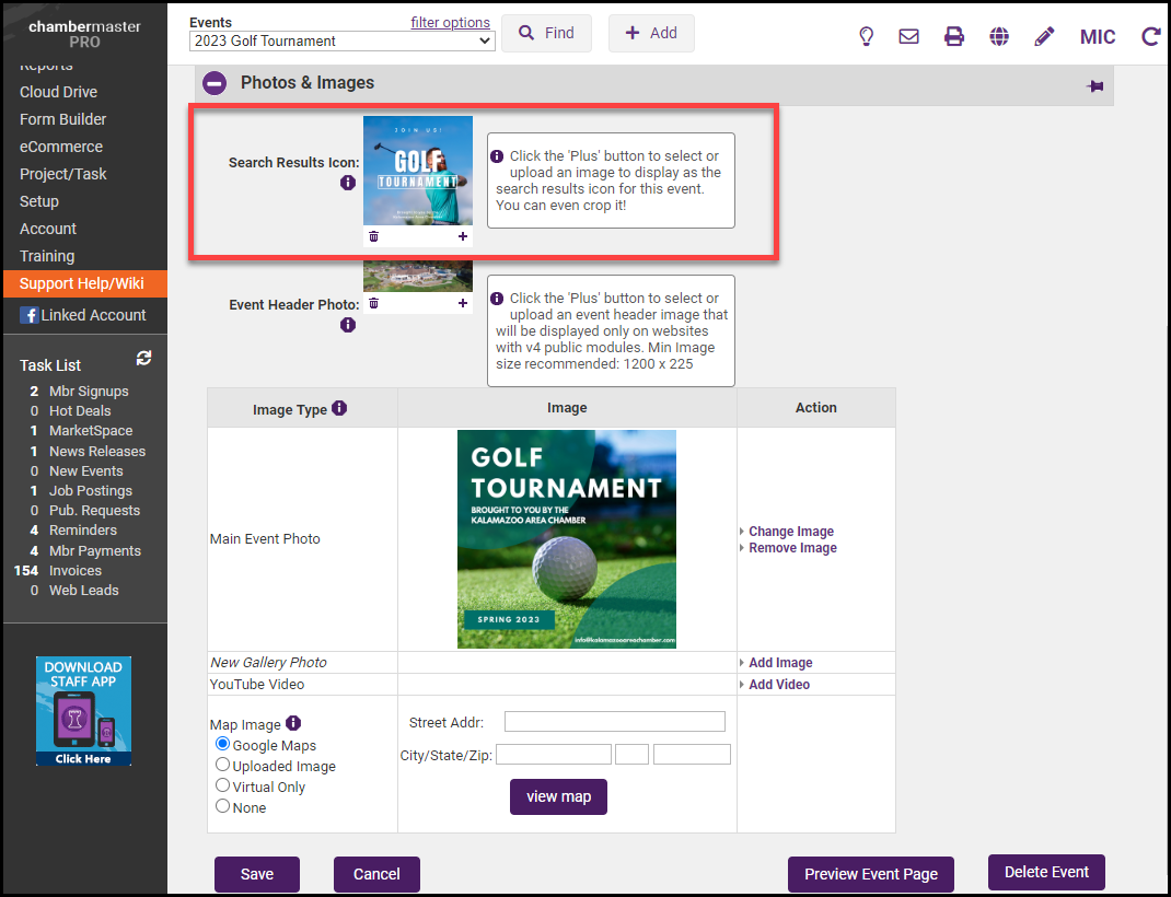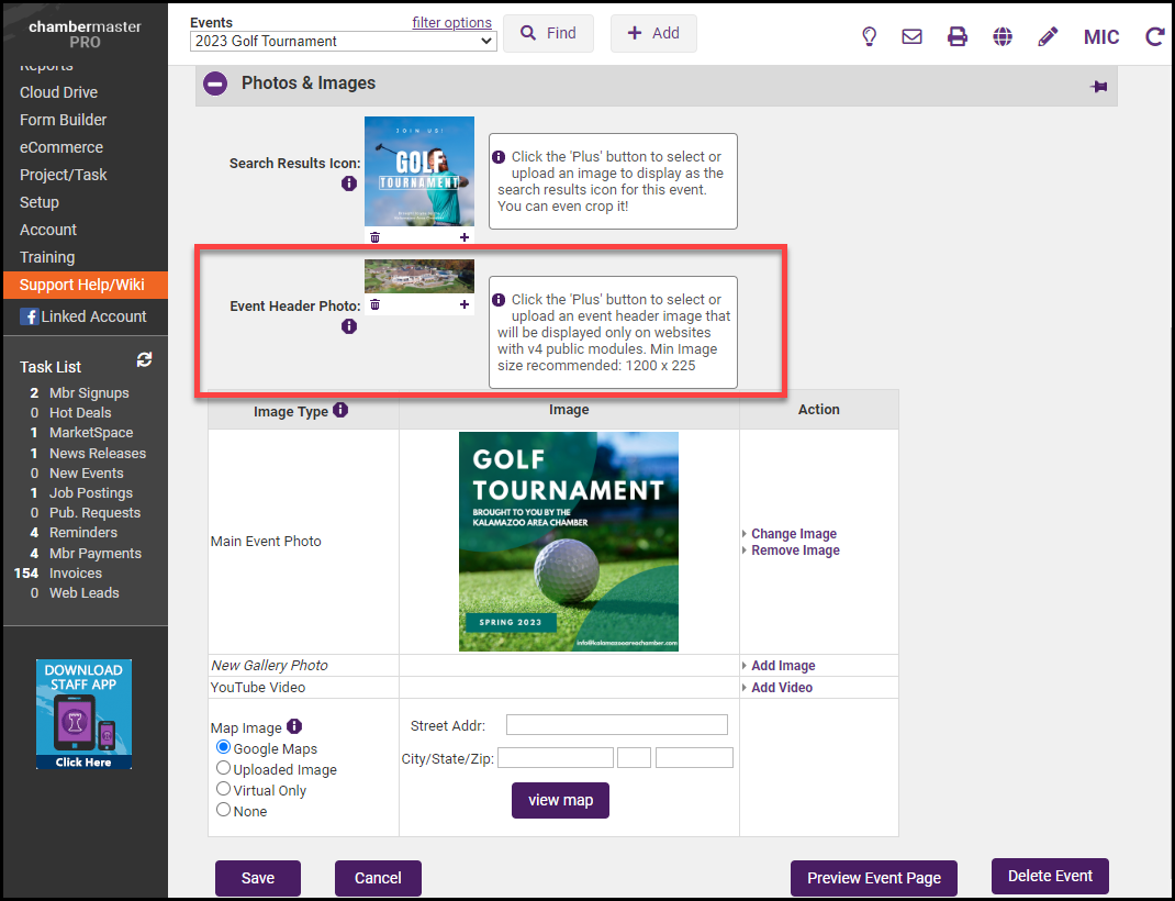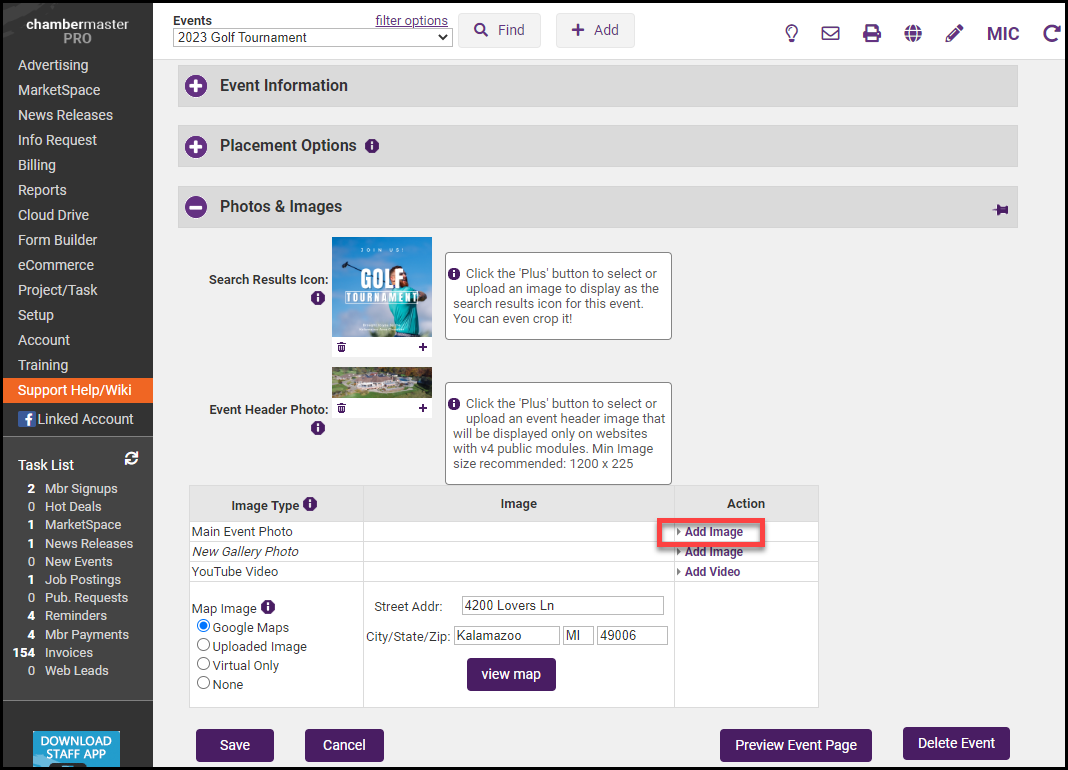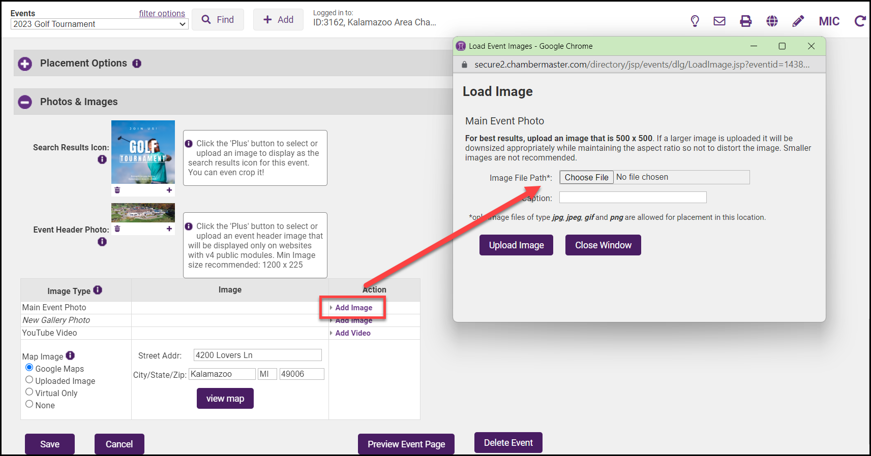 - In the Photos & Images section, select Add Image next to the Main Event Photo area.