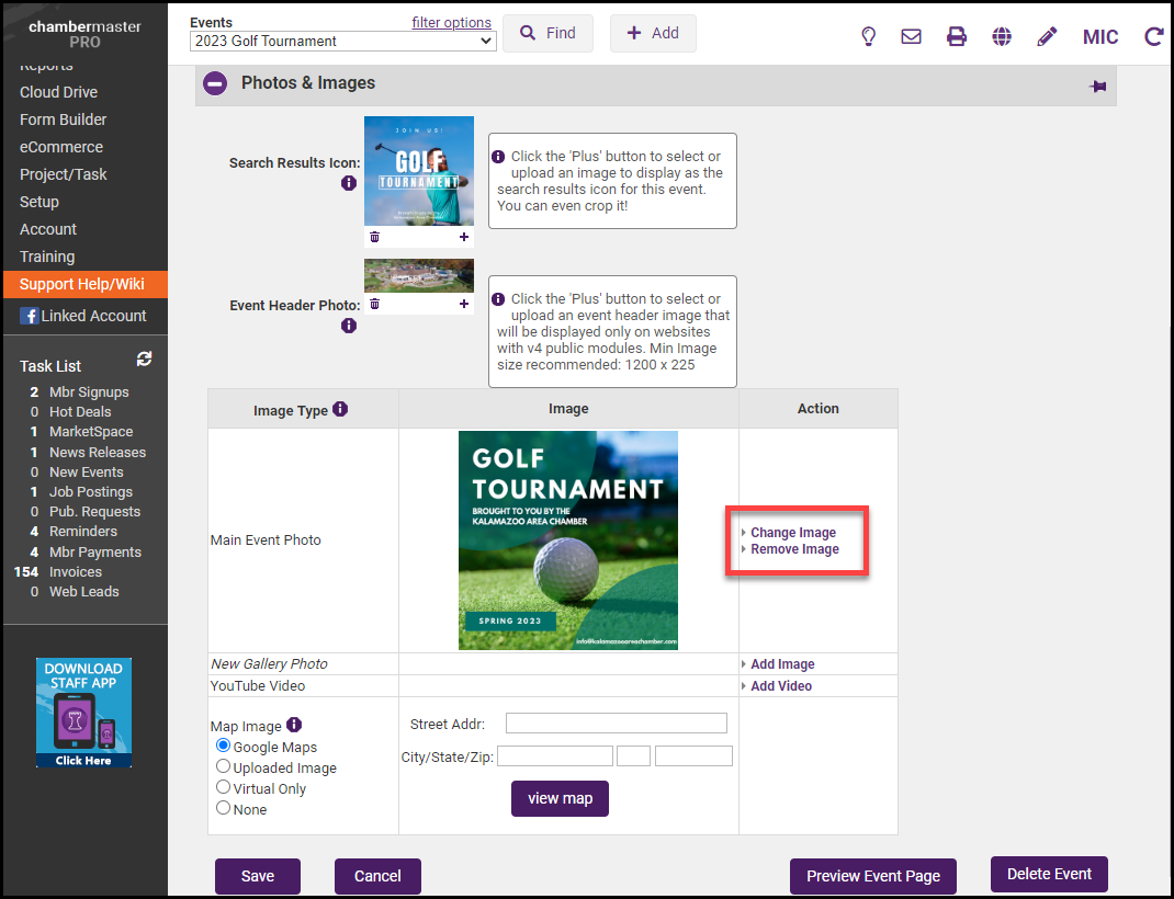 - To remove or change the Main Event Photo, select Change Image or Remove Image.
