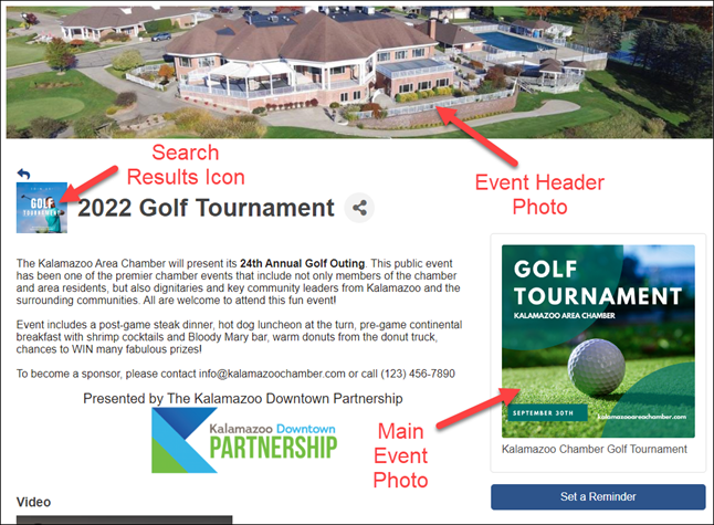 Photos, images, a map, and a video may be added to the event page. One photo may be added as a Main Event photo that is automatically positioned within the event description area, and/or multiple photos may be included in the Photo Gallery which displays in thumbnail size at the bottom of the event page but will be enlarged when a consumer clicks the image. Images are automatically resized to accommodate the space allowed. Images must be .jpg or .gif.