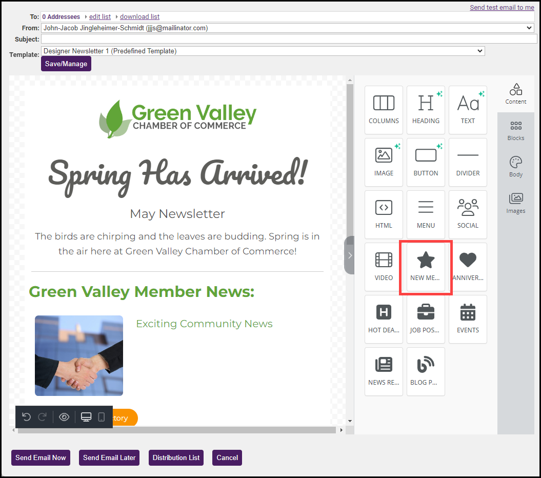 - Configure the New Member block. Your members will be displayed as a bulleted list, with hyperlinks to the member directory. Feel free to edit the block and remove the bullet points or format them in your desired way.