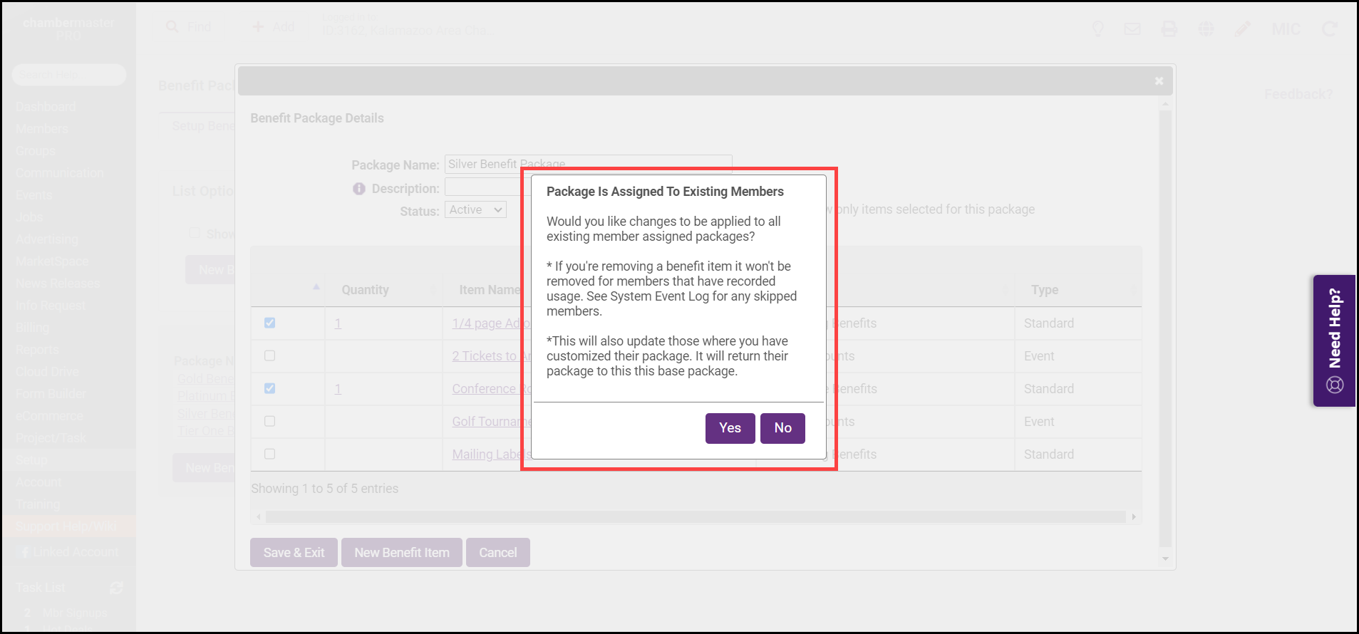 Once you have defined your benefit packages, there may be times that you wish to add additional benefits to those packages. When editing a benefit package currently assigned to members, you will be prompted to confirm that the change should be applied to all members associated with the package.
