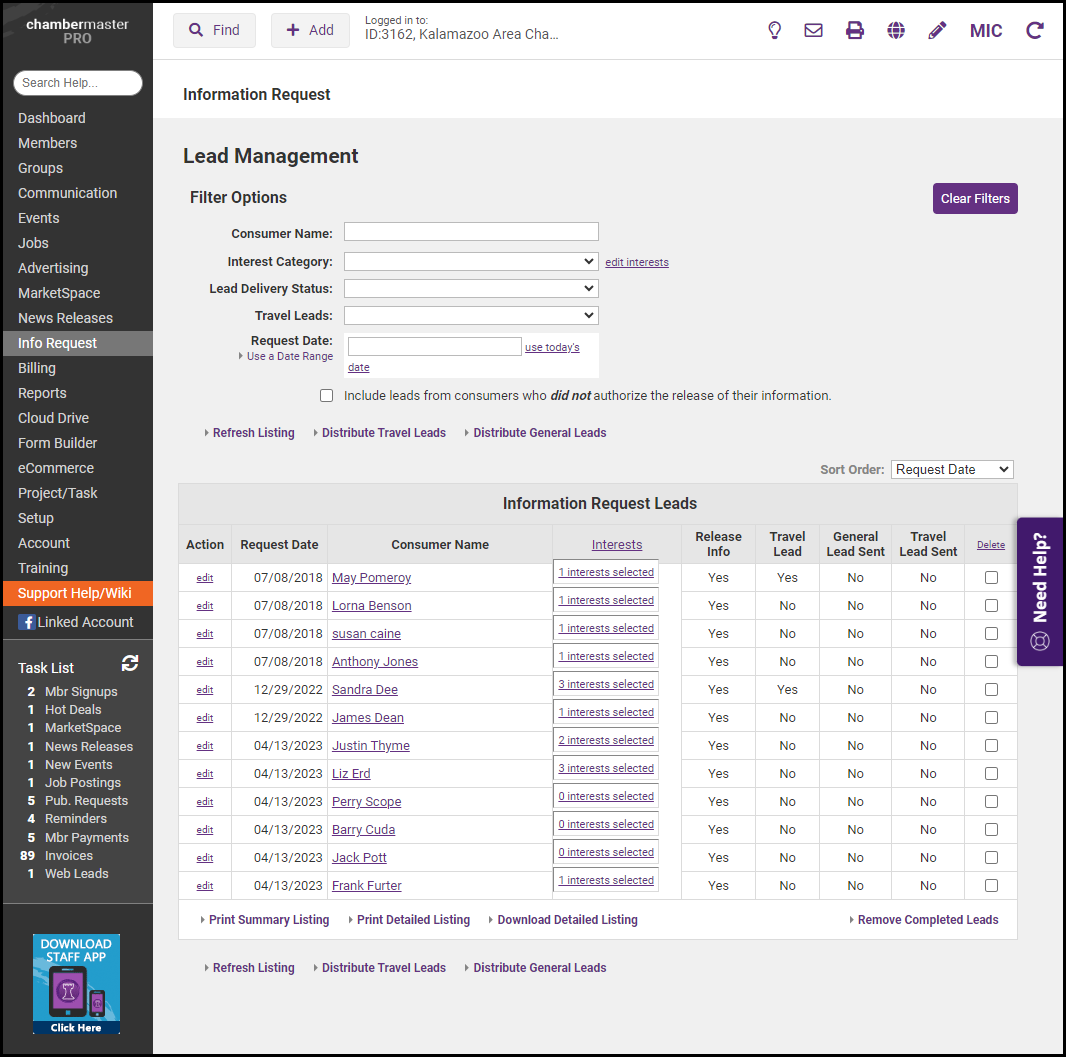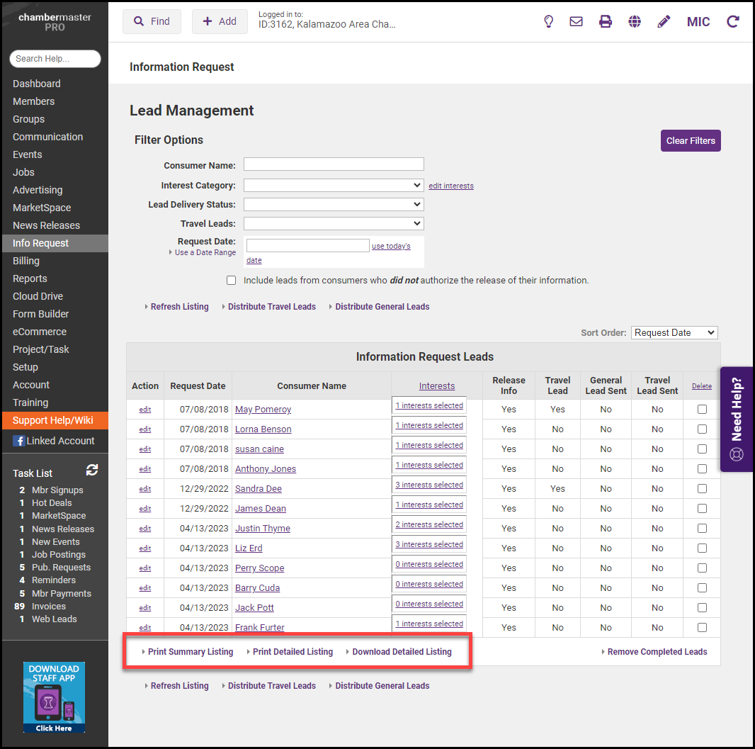 View the lead list on the screen or click Print Summary Listing or Print Detailed Listing to view and print the list.