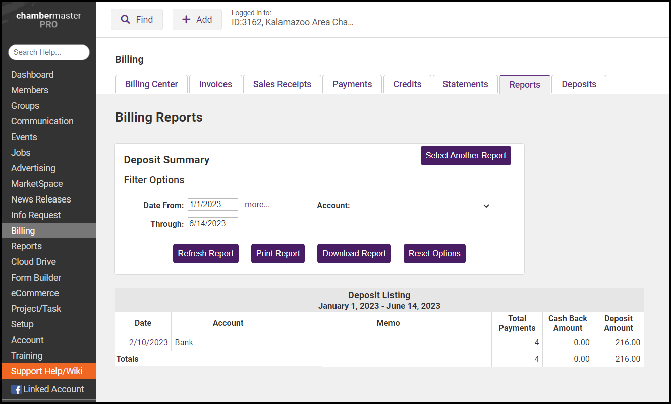 The Deposit Summary report will display deposit transactions.