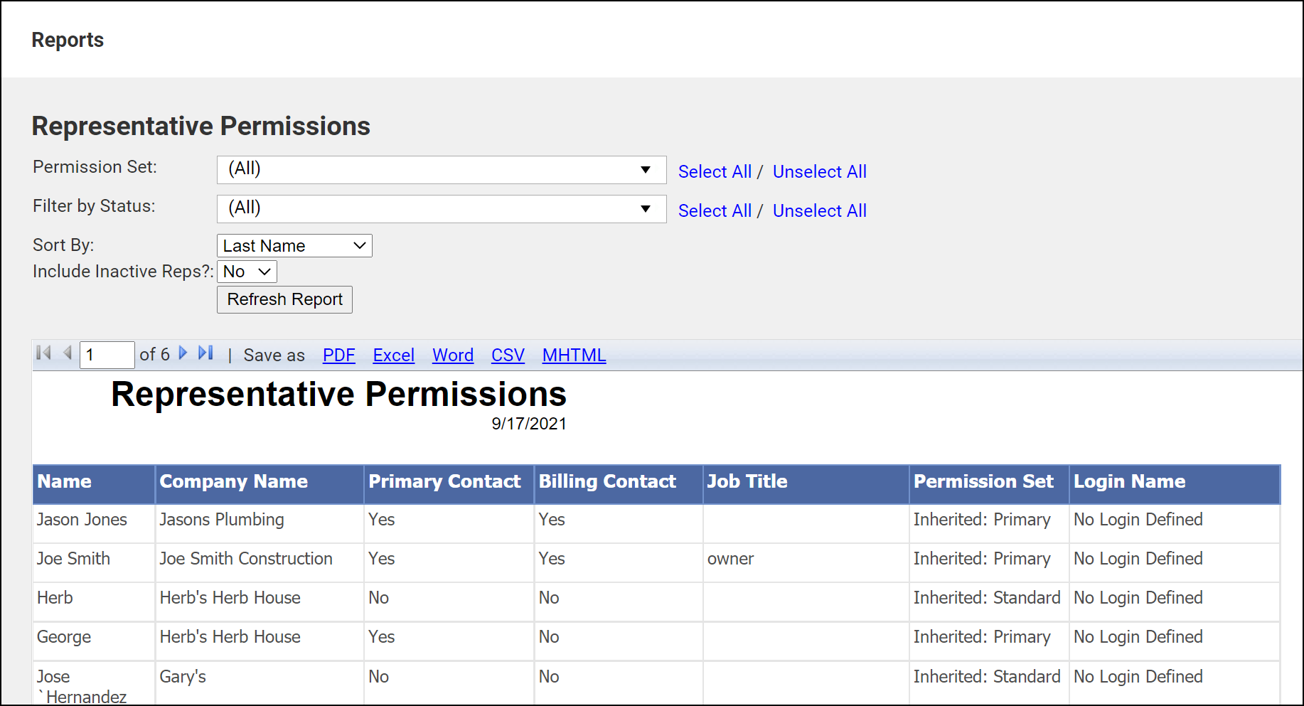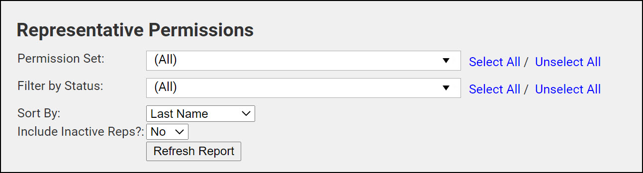 The Representative Permissions report can be used to view the permissions assigned to your reps and to determine if your reps have login credentials to the Member Information Center (MIC). You can filter the report to specific statuses as needed.