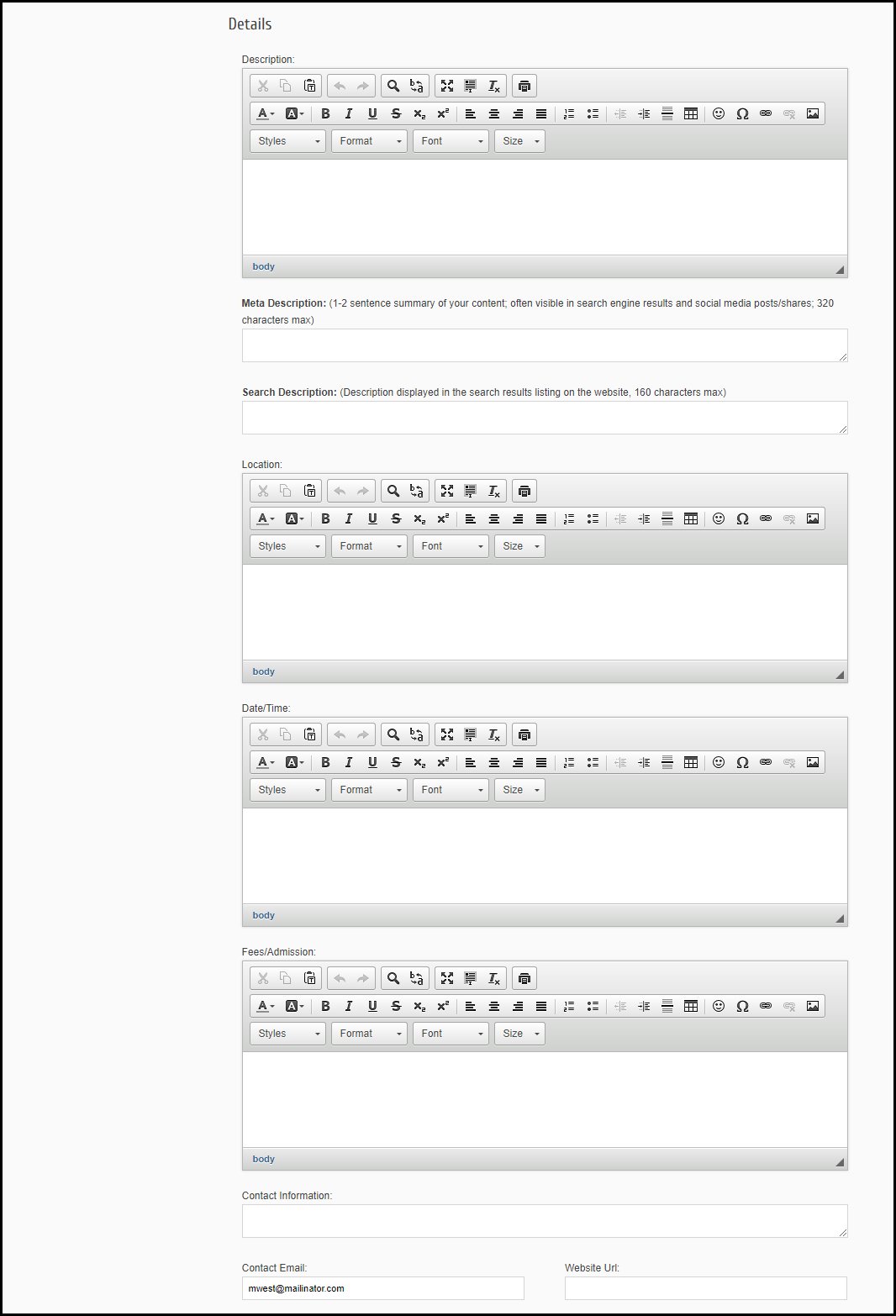 Fees/Admission: Enter the fee description to be displayed on the website.