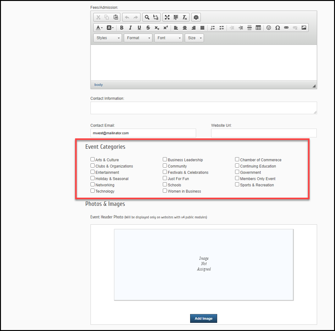 Start/End Date/Time: Enter the correct dates for the event. A different end date is only needed when a single event runs multiple days – like over the weekend. NOTE: All Day Event is selected by default, deselect this checkbox if you wish to enter exact times.