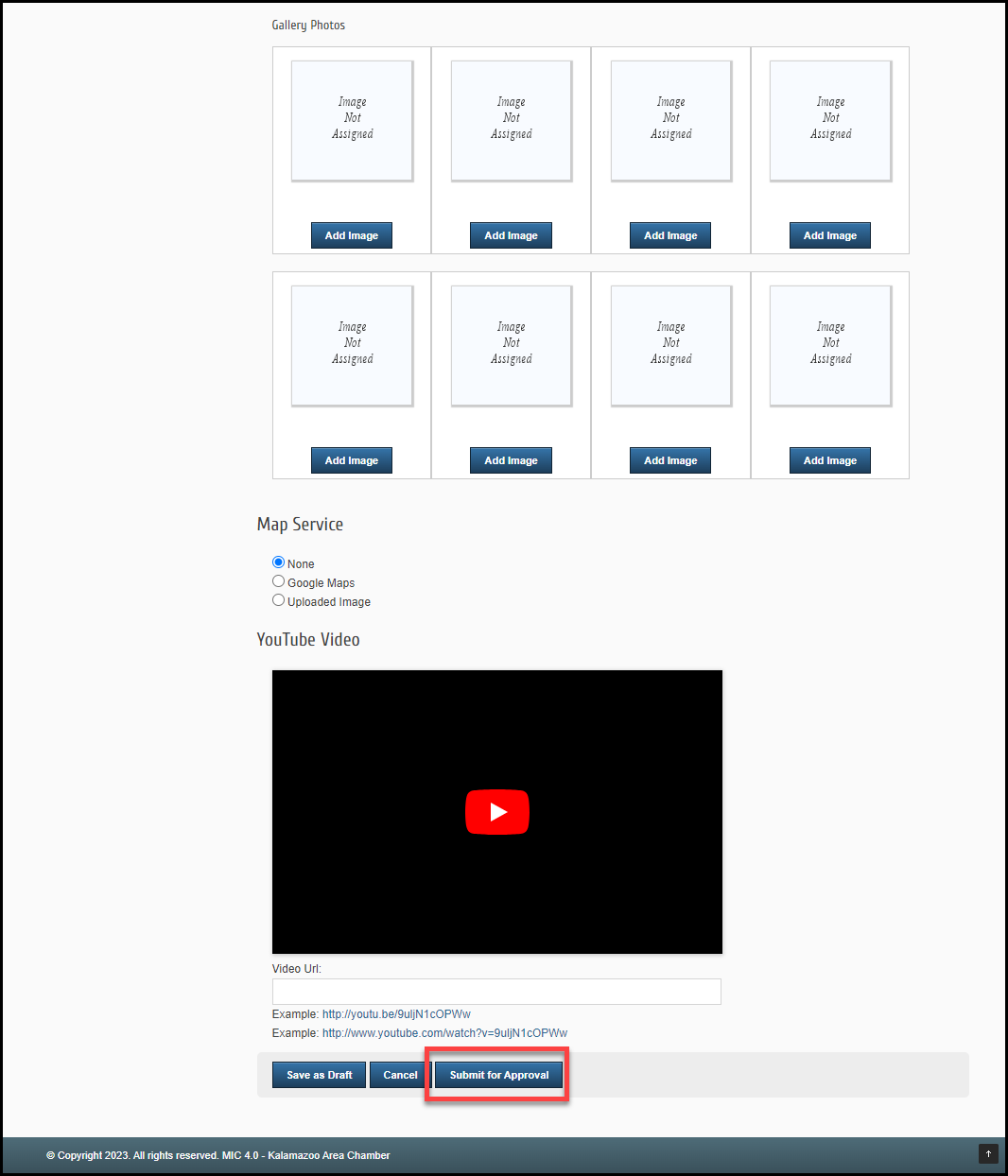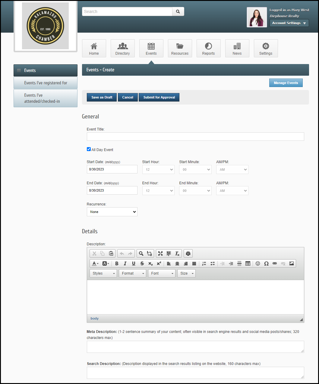 Once you've added all of the information for your event, click Submit for Approval. The event will be submitted to your organization and will not be displayed on an event calendar until it has been approved.
