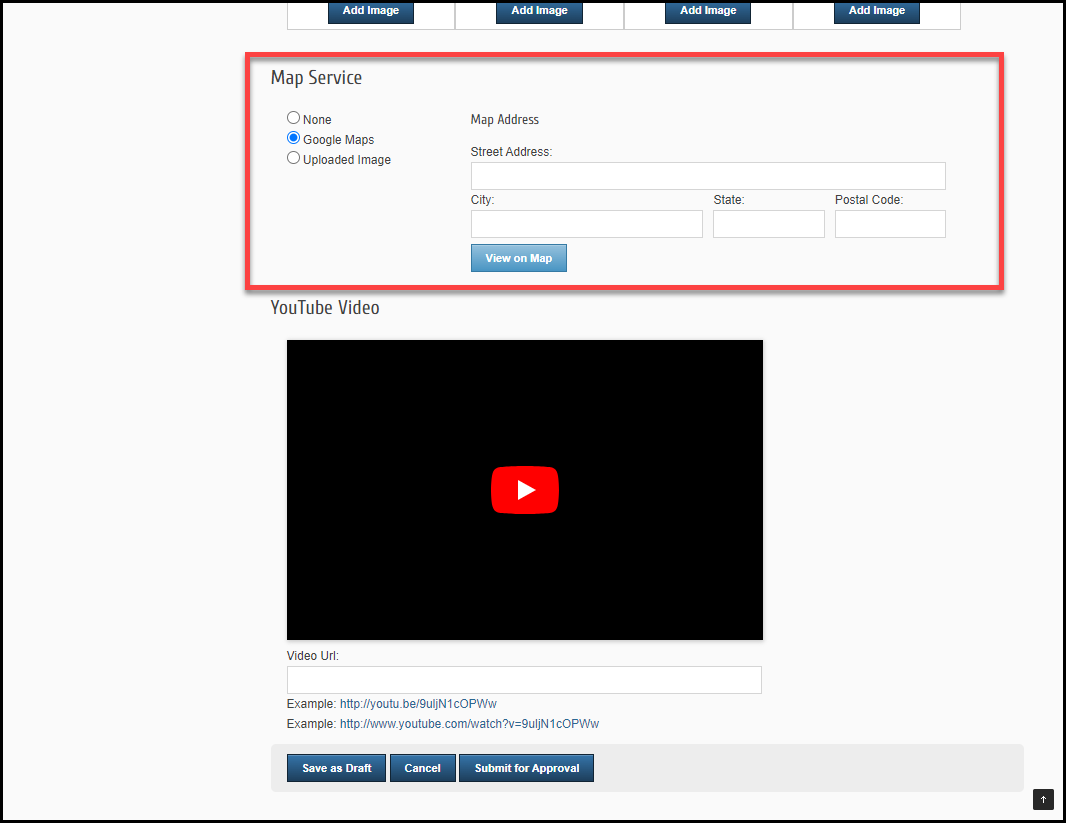 In the Map Service section, select if you would like to upload a map image or if you would like to display the location of the event using Google Maps.