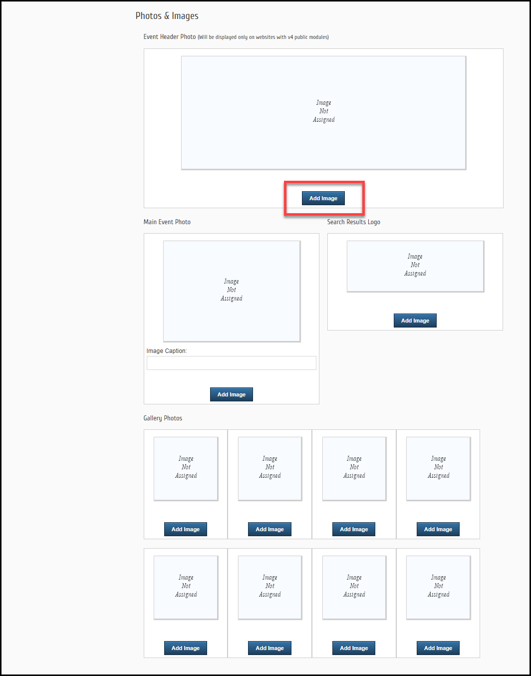 In the Photos & Images section, select Add Image in each area to upload.