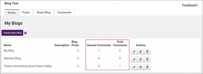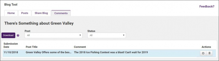 - On the Blog Tool Home tab, you can click on the Unread Comments or Total Comments numbered link. Comments that are submitted will immediately display on the Comments tab with a dark, bold color for their title, which indicates it is Unread. After the comment has been clicked (indicating someone has read the comment) then the comment will change to the standard black font, which indicates it is Read. Read status is marked no matter which staff person clicks the title of the comment; it is not particular to a certain staff login.