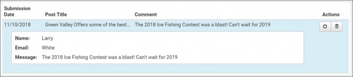 To view the details of a comment, click on the comment. The content of the comments, along with the name of the visitor who posted the comment will display.