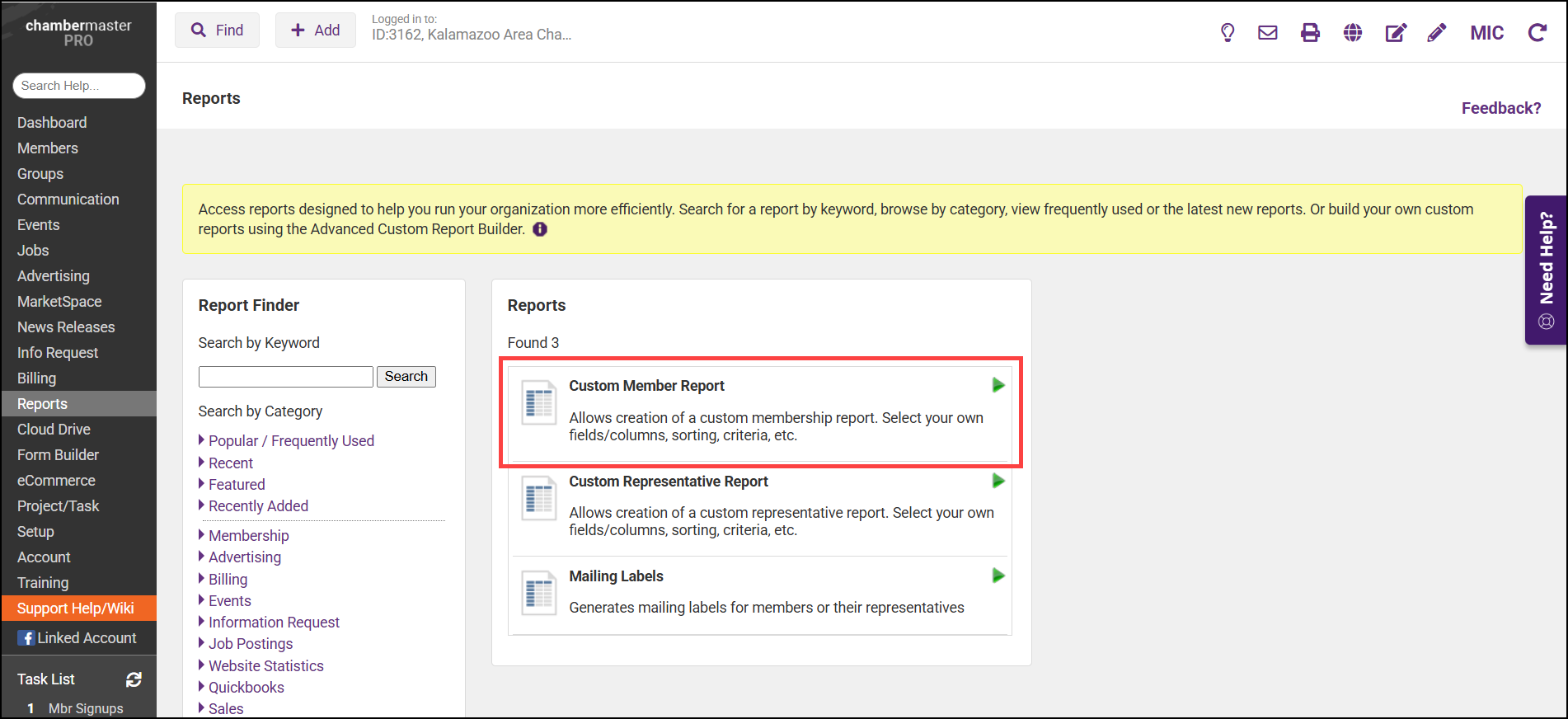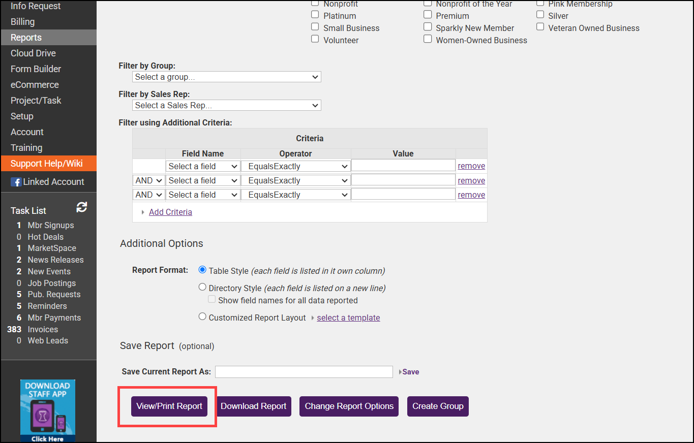 - Click Custom Member Report and then click the green arrow.