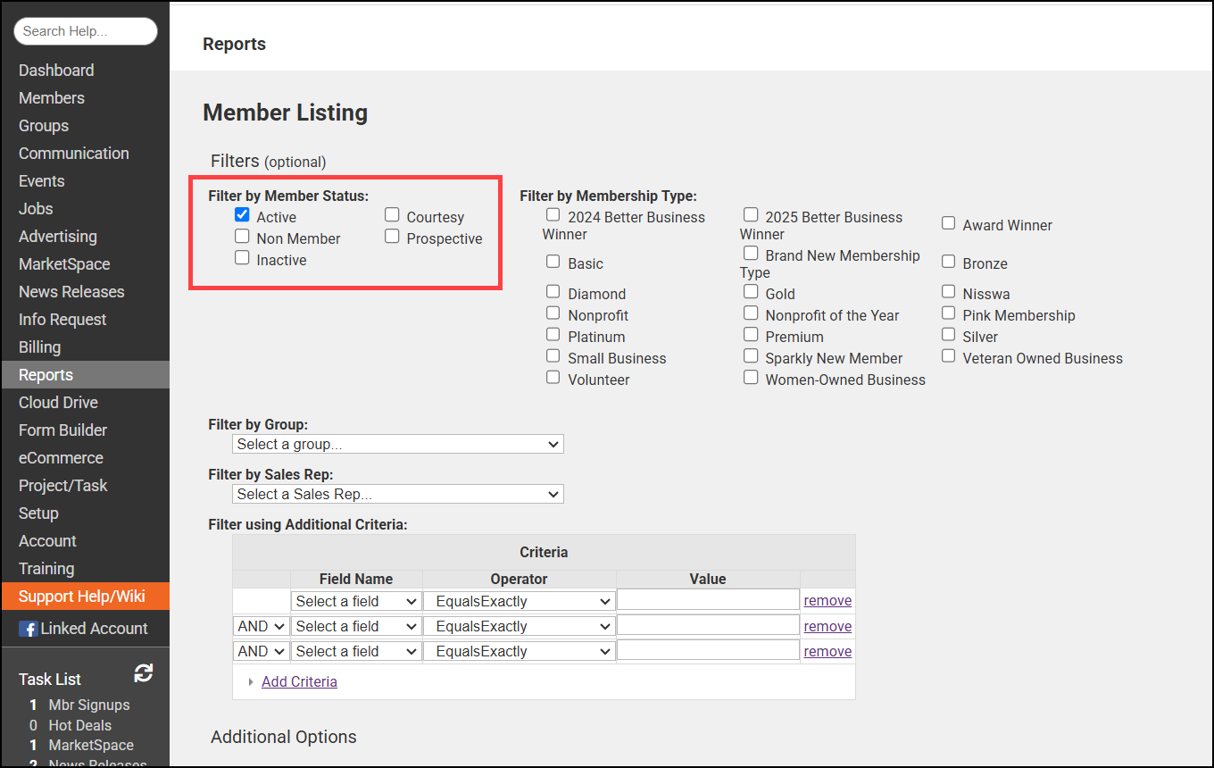 - In the Filter by Member Status area, select the checkbox for Active to include Active members in the report.
