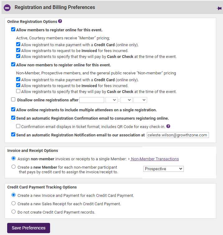 Preferences include online registration options for members and non-members, available payment methods, general invoice options, and non-members' invoice options (if applicable). In addition, email confirmation notices and email notifications of registration may be specified if desired.
