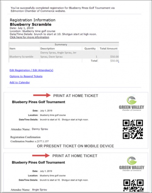 - If you have selected Send an automatic Registration Confirmation email to consumers registering online, the Include QR Code in Confirmation email for easy check-in option will be displayed. This option will include a QR Code in the event confirmation. The event confirmation will display a "Print at Home" ticket. At your event, using the Staff App, you can scan the user's QR code right from their smartphone or a printed version of their email. Once scanned, the attendee will immediately be marked as attended in the system.