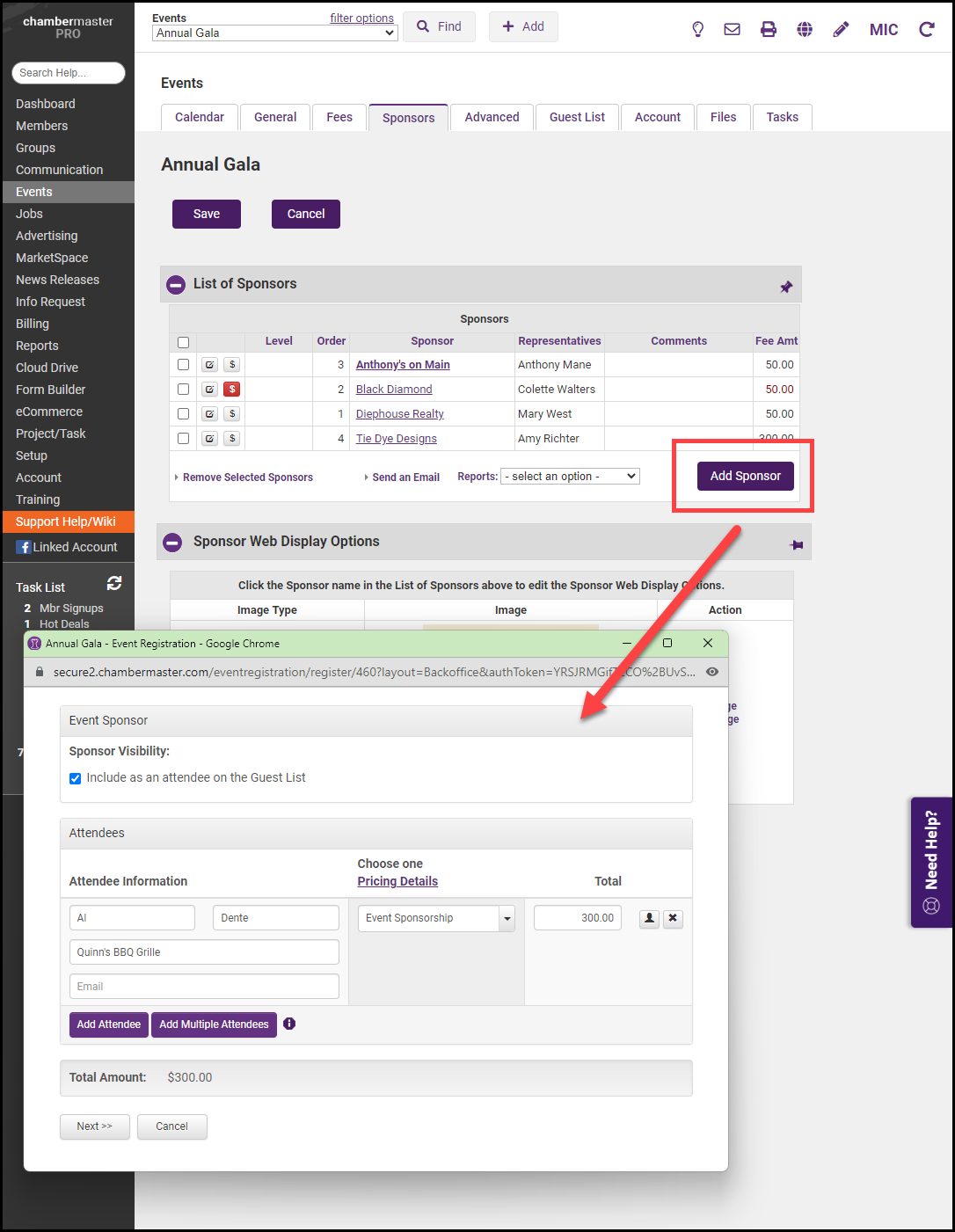 - In the registration window, be sure to select the fee item that includes sponsorship. Complete the required sponsor information.