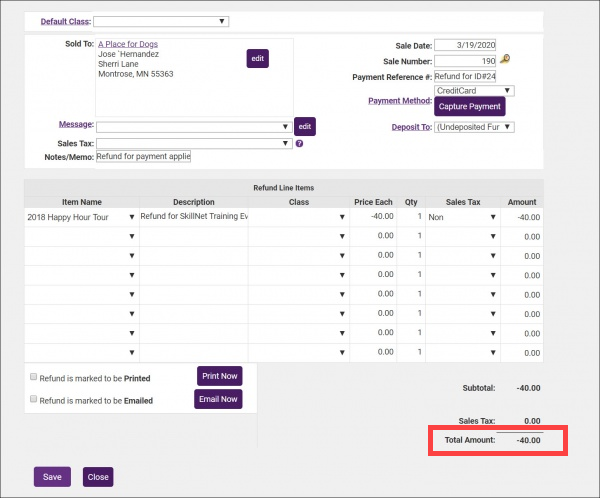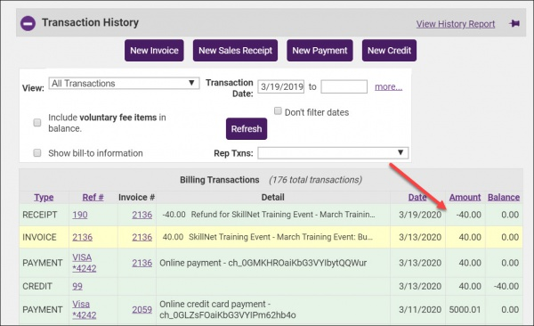 - Click Save. The refund will be displayed in the member's Transaction History as a Receipt.