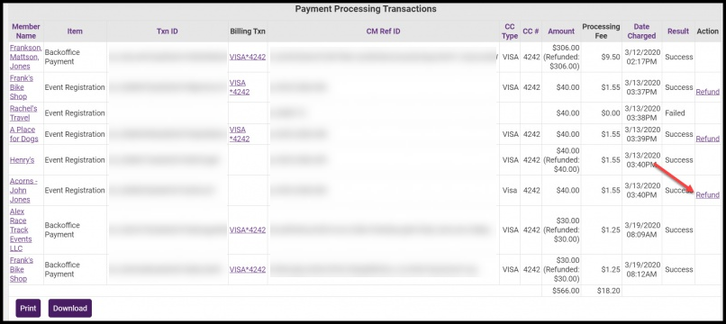 In the Actions column, click Refund for the desired transaction. IMPORTANT: The Refund option will not be available if you have previously created a refund, the charge is over 90 days old, or the charge did not process successfully.