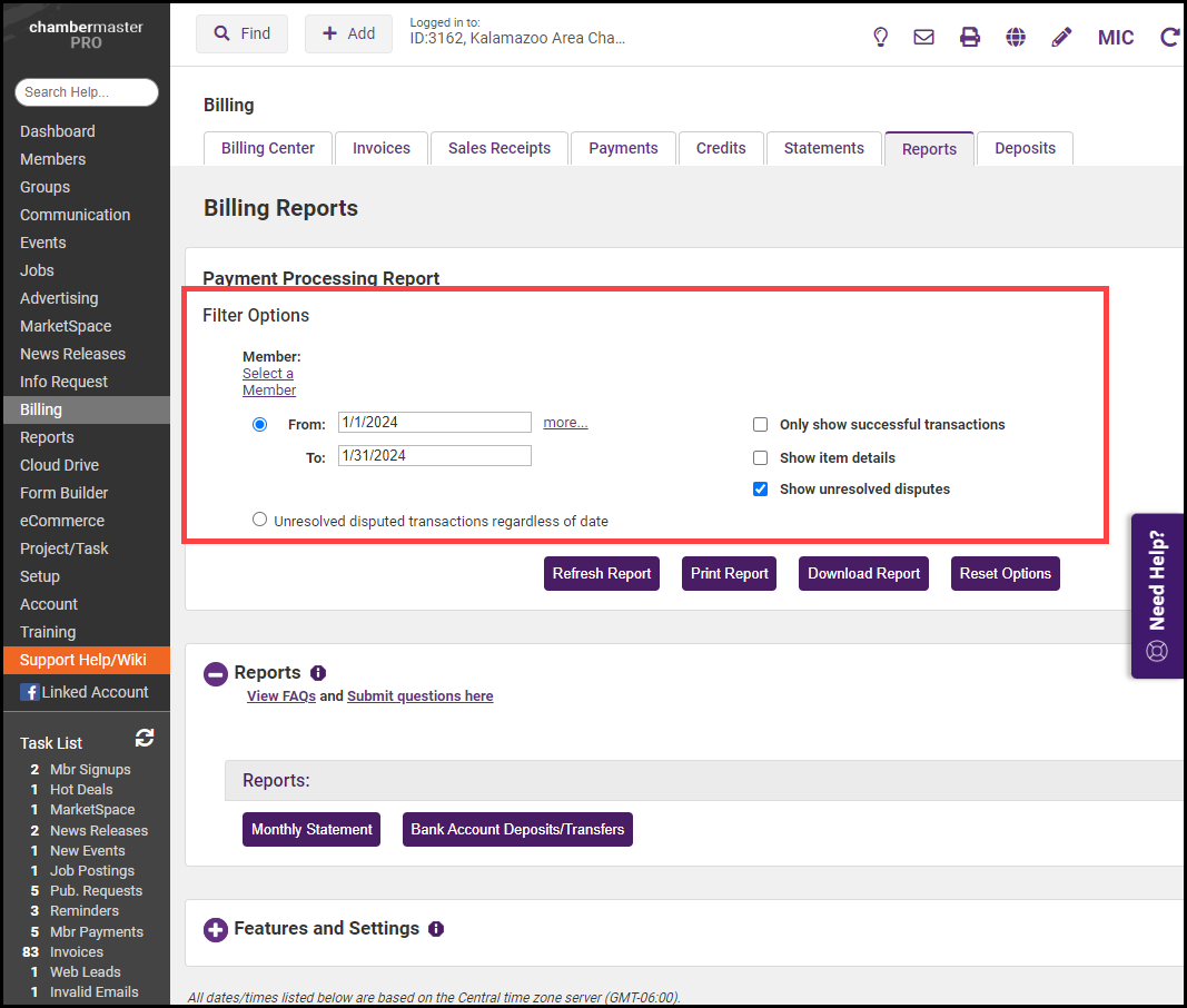 Enter any desired filtering criteria, such as date range. You can also click the Select a Member link to search for transactions for a specific member. Click Refresh Report.