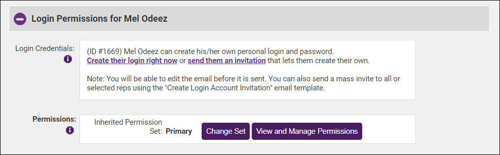 - The system will default to an inherited permission set, if needed, click the Change Set button to update the rep's permission set. See Understanding Permission Sets for further information on permission sets.