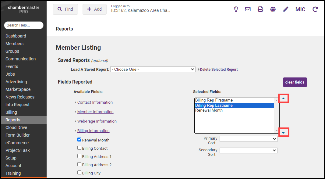 - You may change the order of the Selected Fields by selecting the field and using the arrows to move the field.