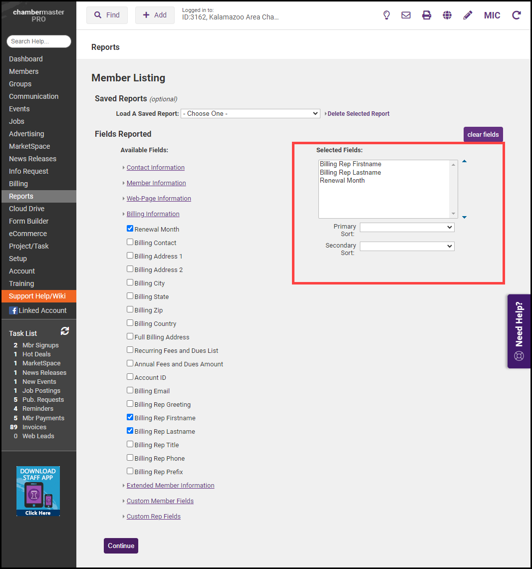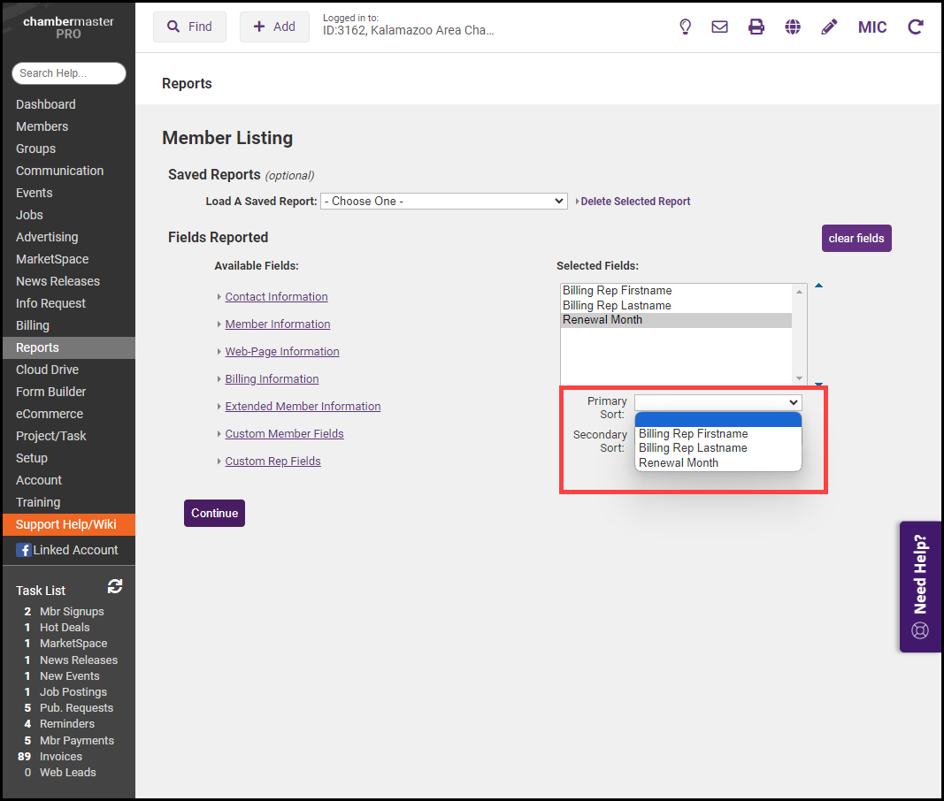 - Use the Primary Sort and Secondary Sort dropdown menus to choose which of the Selected Fields to sort the report. Click Continue.