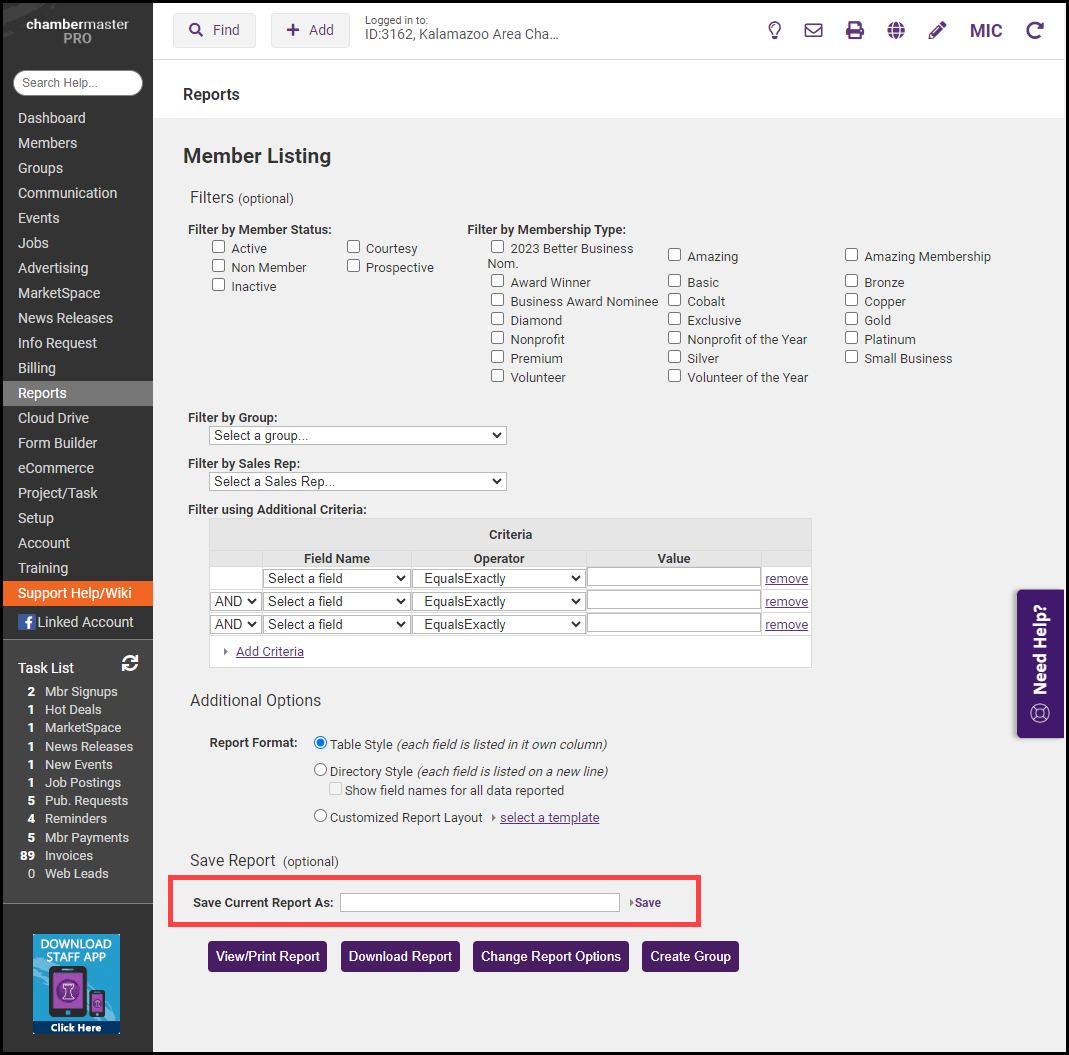 Select Save Report As to save the report for future use. The report field selections, filters, criteria, and formation options will be retained, however, the report will be refreshed every time the saved report is accessed.