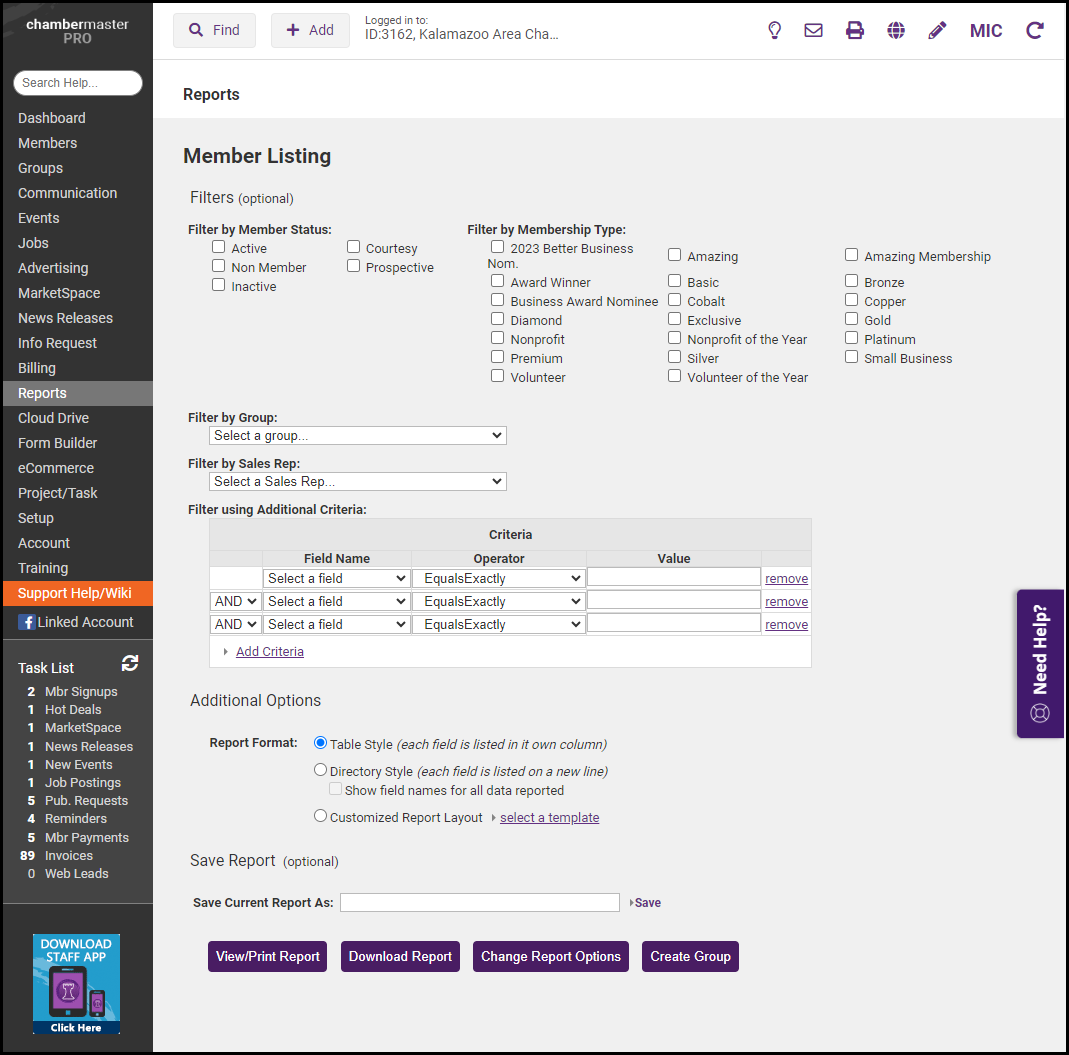 - Click Custom Member Report and then click the green arrow.