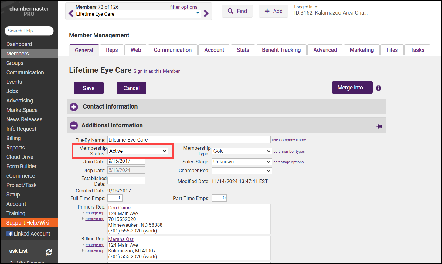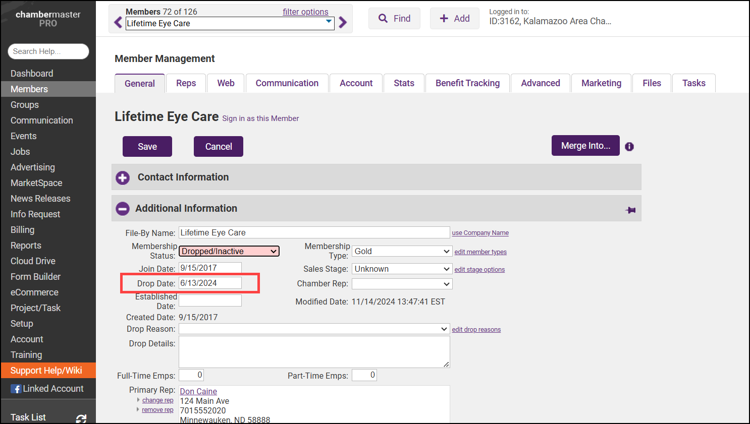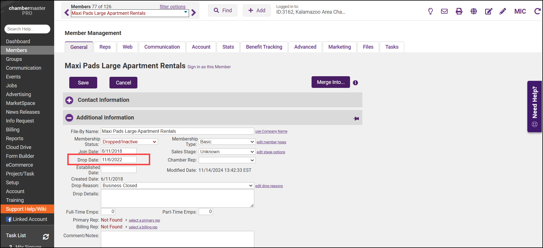 - In the Additional Information section, use the Membership Status dropdown menu to change the member from Active to Dropped/Inactive. Do not select Save.