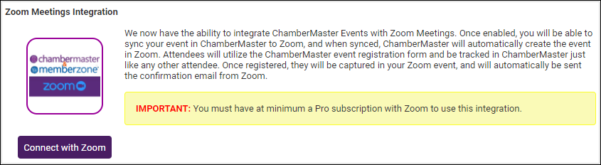 We now have the ability to integrate ChamberMaster/MemberZone Events with Zoom Meetings. Once enabled, you'll be able to sync your event in ChamberMaster/MemberZone to Zoom, and when synced, ChamberMaster/MemberZone will automatically create the event in Zoom. Attendees will utilize the ChamberMaster/MemberZone event registration form and be tracked in ChamberMaster/MemberZone just like any other attendee. Once registered, they'll be captured in your Zoom event, and will automatically be sent the confirmation email from Zoom. See the Zoom Meetings Guide for more information on joining Zoom meetings as a host or participant, as well as Zoom default meeting settings.