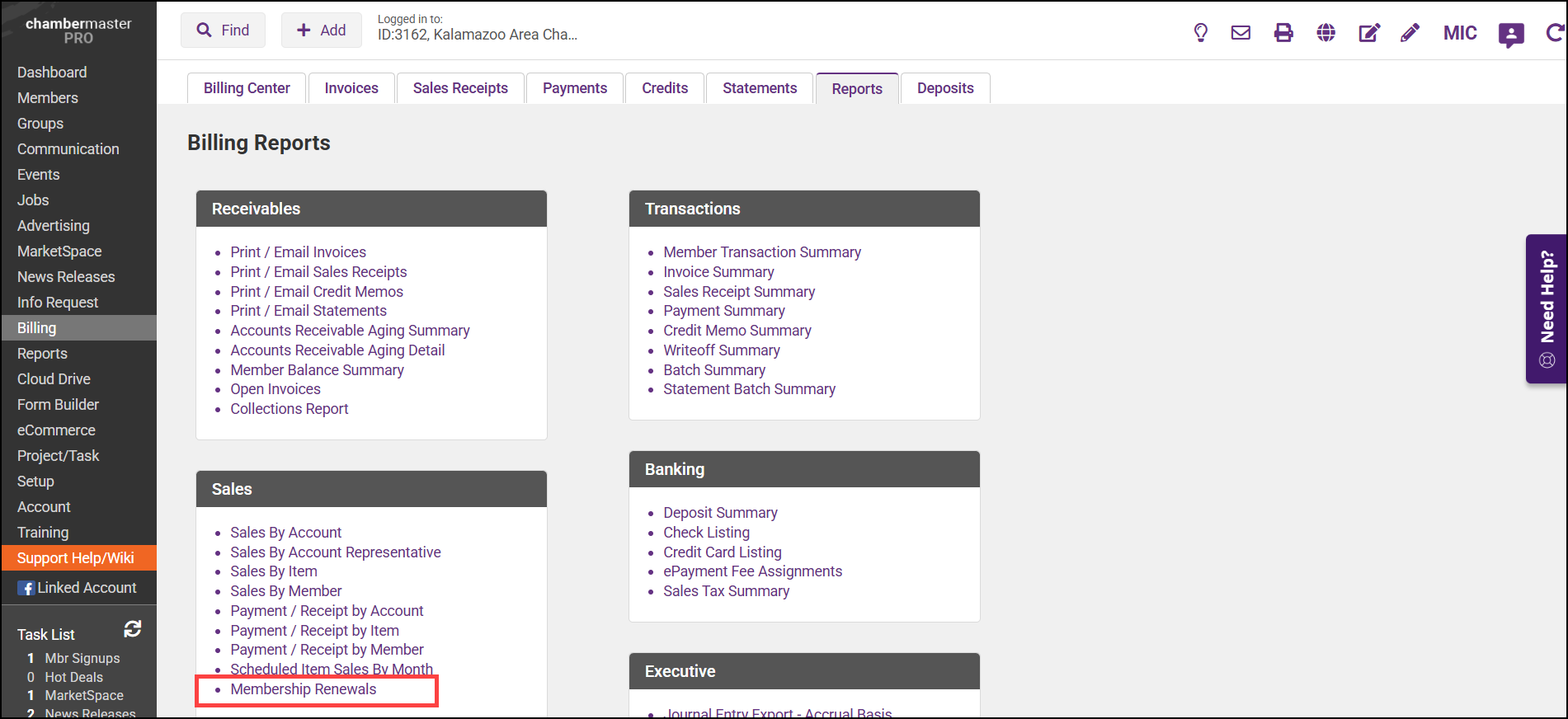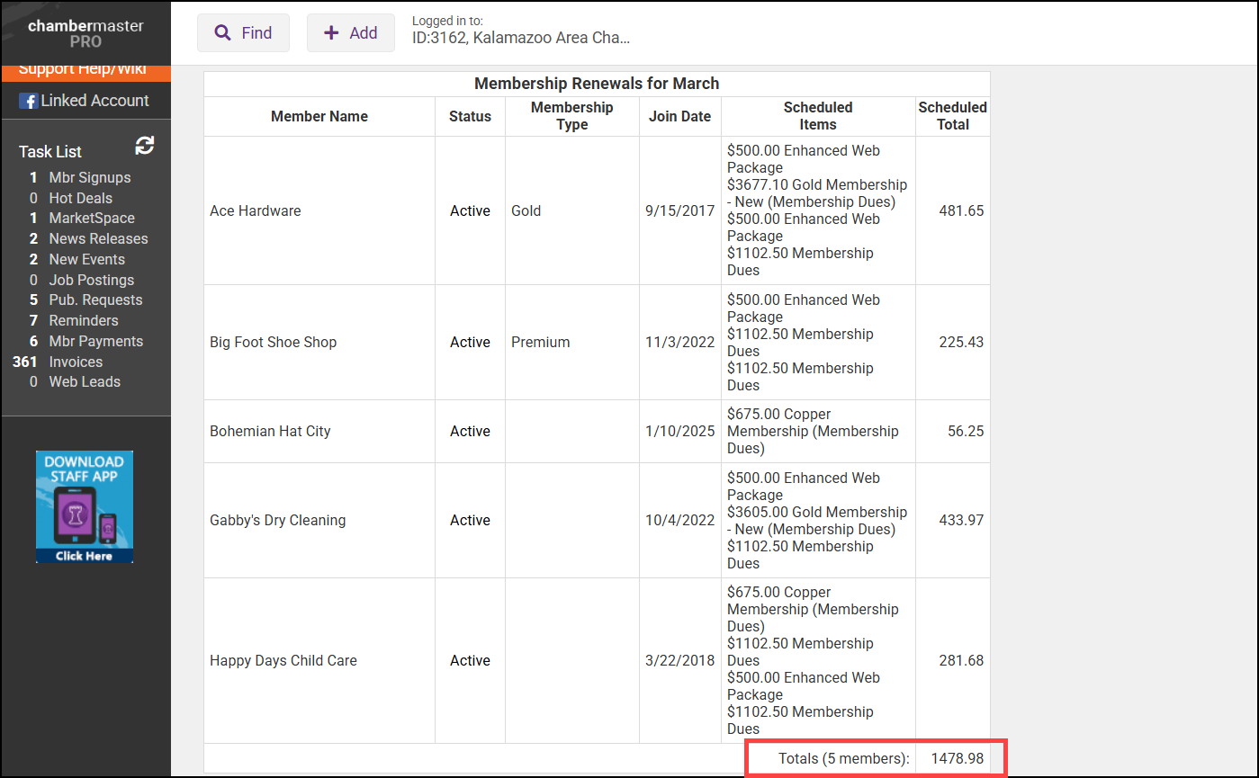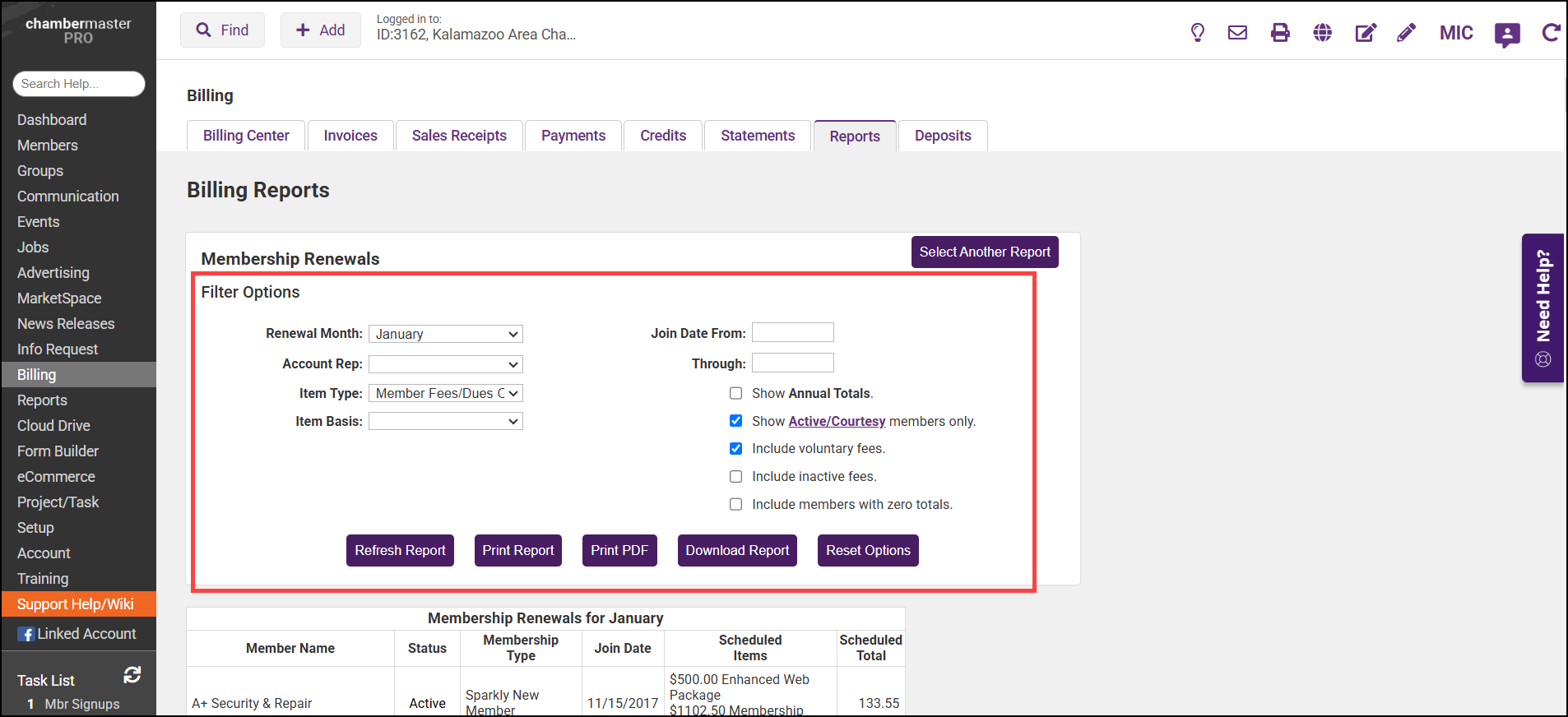 Before generating your batch of invoices for upcoming renewals, you may wish to view a report of the upcoming renewals. This report can be useful in identifying members for which dues should be updated, or even members that should be dropped. Generating and analyzing this report before creating your batch of invoices will help prevent invoices from being created in error.