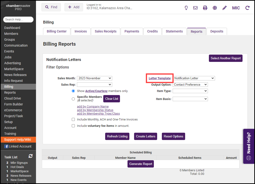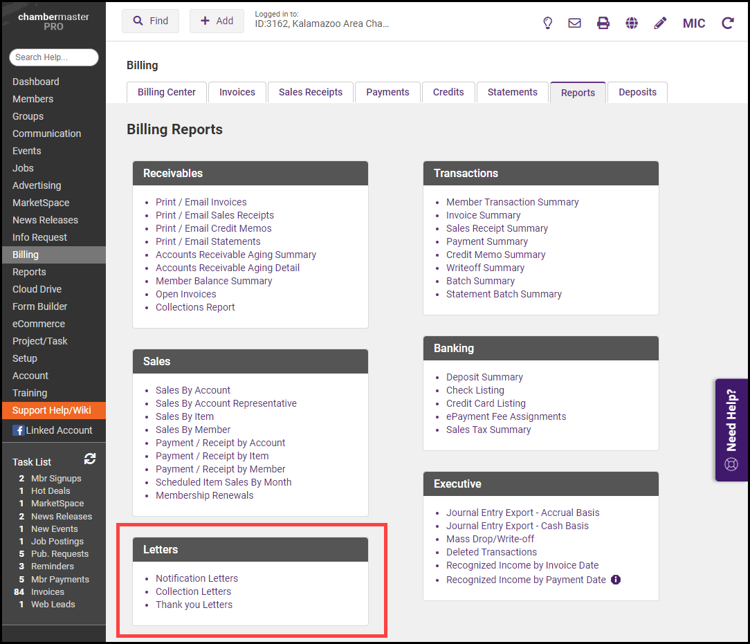 Click the desired letter type (Notification, Collection, or Thank you) in the Letters area of the Reports tab.