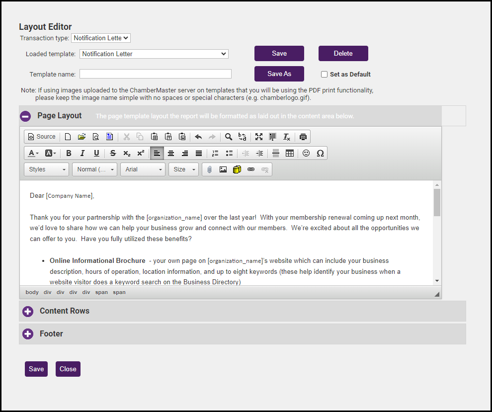 Letter Templates may be edited and/or new templates created for Notification, Collection, or Thank You Letters. Click here for a short video demonstration.