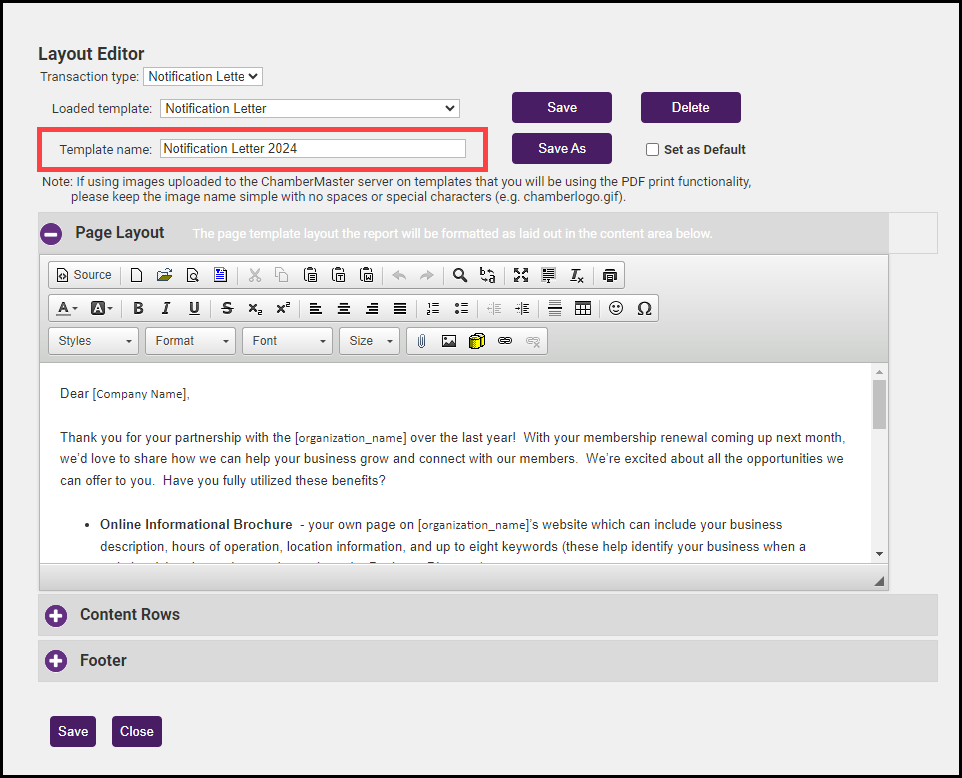 - To save changes you've made to the Letter Template, enter a new Template Name and click Save As.