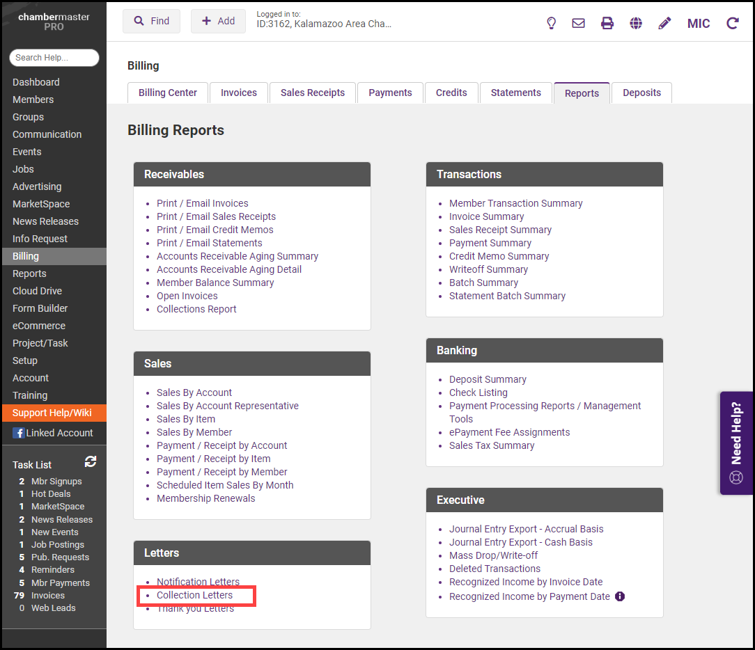 On the Reports tab, select the Collection Letters link.
