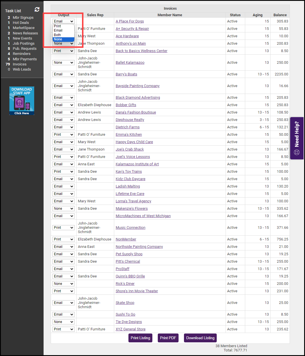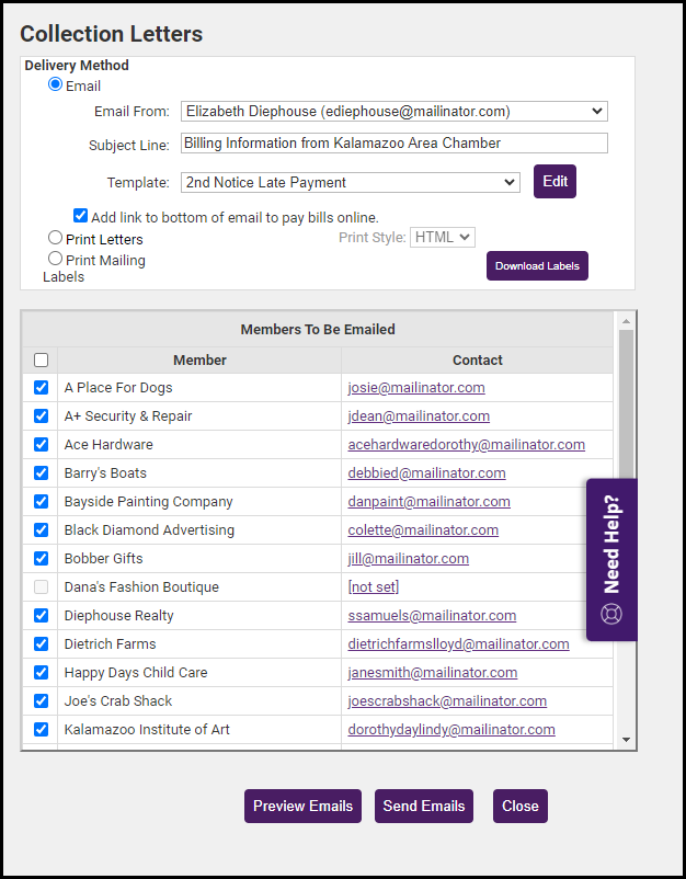 Double-check the Output column to ensure the correct delivery method is selected for each member. Select None in the Output column to exclude the member from receiving the Collection Letter at this time.
