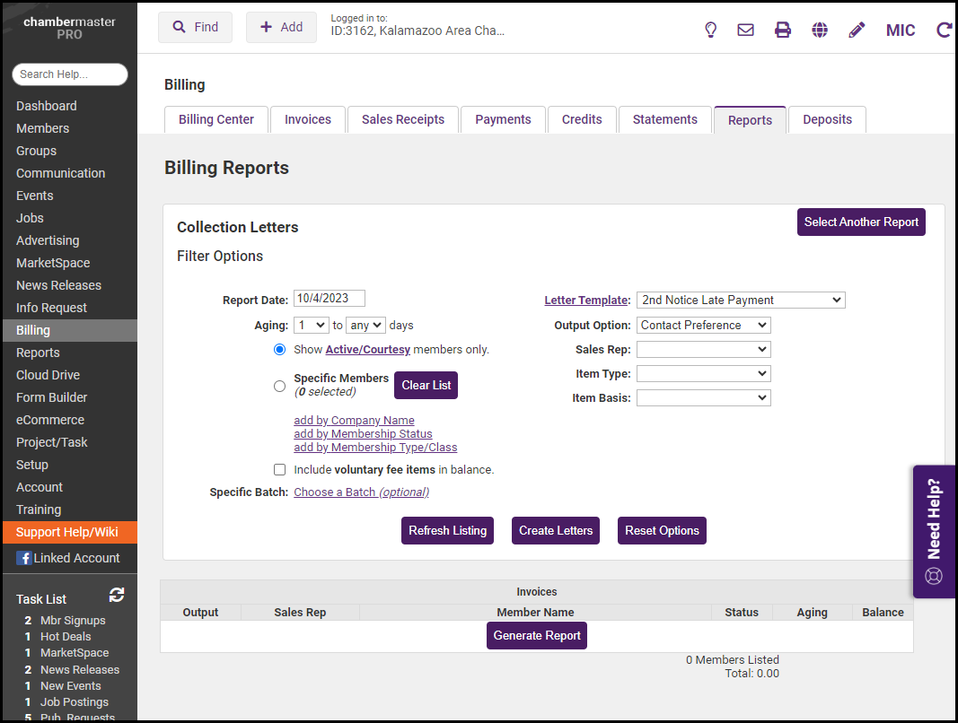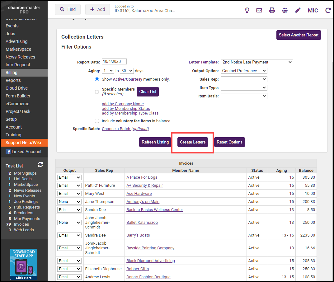 Collection letters are intended for those who have not paid their invoices. Select who should receive these letters and which letter they should receive by selecting the appropriate filter choices.