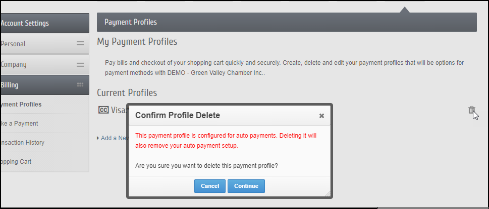 - Members will receive a popup message indicating this Payment Profile is configured for Autopay and will need to confirm they wish to delete this Payment Profile by selecting Continue.