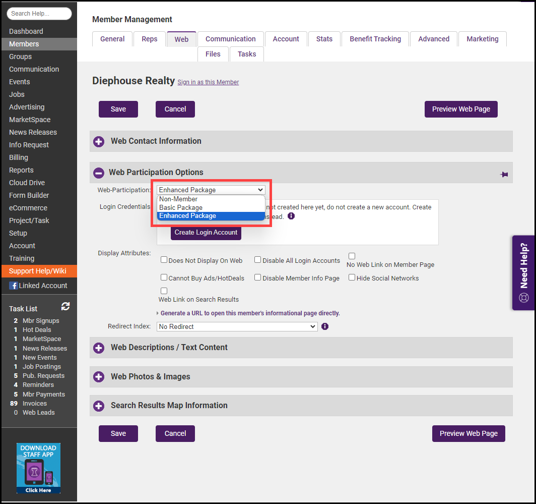 After the Marketing Package has been added to your database, indicate which member(s) should have enhanced Business Directory options by changing their Web Participation status to Enhanced. If the Marketing Package selections are not currently available in your database (such as the Marketing tab or the Enhanced Web Participation selection) contact our Account Management Team.