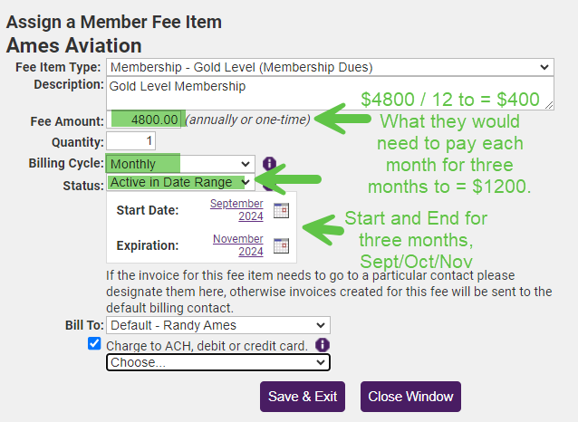 Yes, this can be set up to accommodate any number of consecutive equal payments. How? Assign a monthly epayment fee item to this member and set the Status to Active in Date Range. The Start Date should be the 1st month that you want the payment to be charged and the Expiration to the month of the last payment (inclusive). The amount charged per month will be the Fee Amount / 12 so you will need to inflate the Fee Amount assigned so that when it divides by 12 it will be what you want to charge monthly. The example shown here would charge $400 in April, May, and June totaling a $1200 annual fee but requires putting $4800 in the Fee field. Note: the Fee field is not visible to members or in your accounting totals.