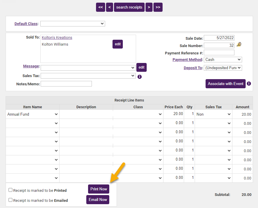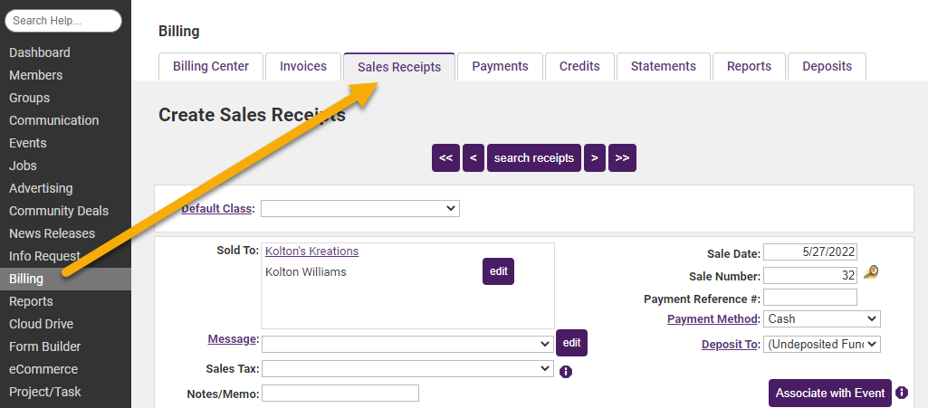 When Credit Card Payment Tracking Options in the Fees and Registration Preferences are set to create new Sales Receipts when a credit card is processed, the sales receipt will be created automatically when the sale is processed. Access the Sales Receipts tab in the Billing module to print or email the receipt.