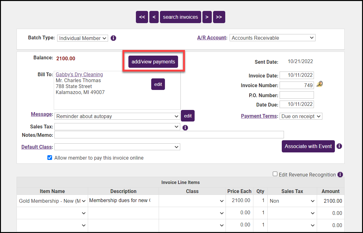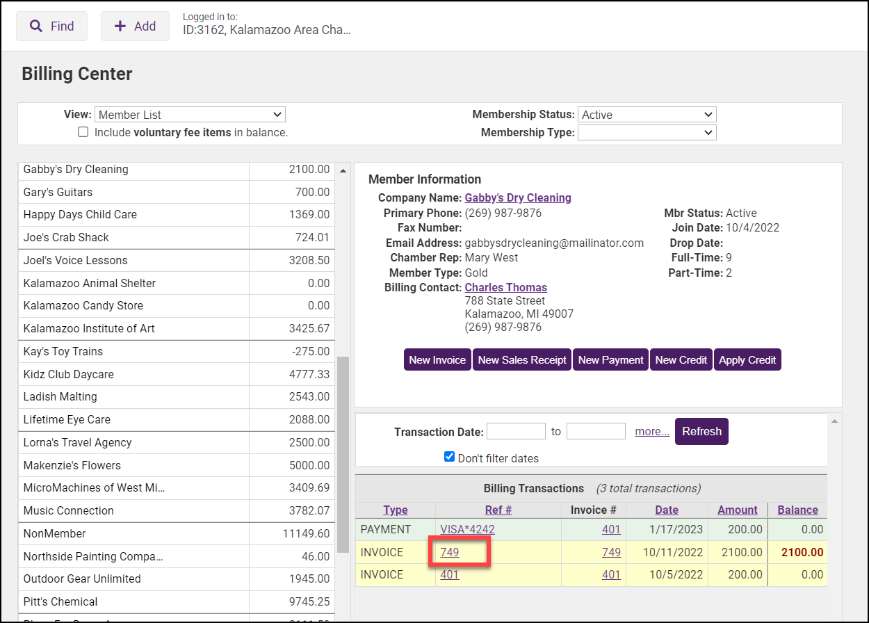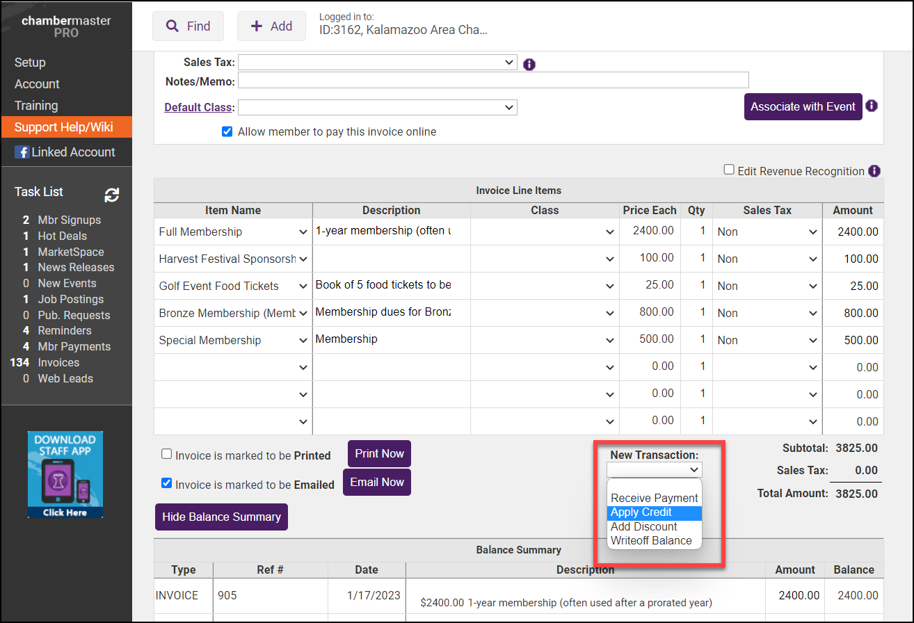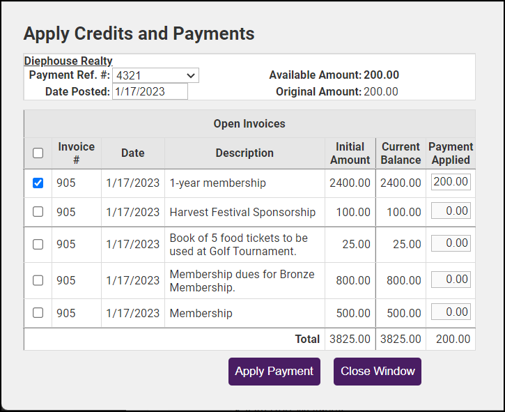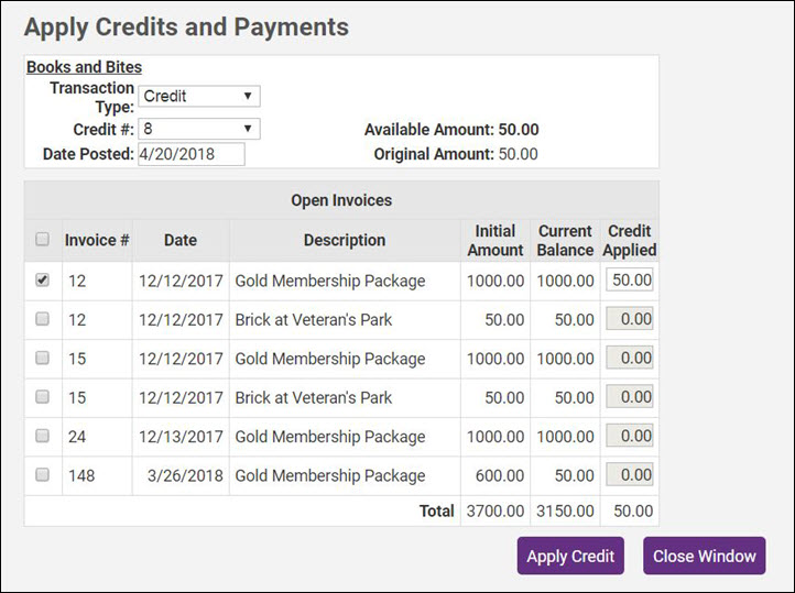 If a member has an open invoice, you may apply a credit to that invoice prior to receipt of payment.