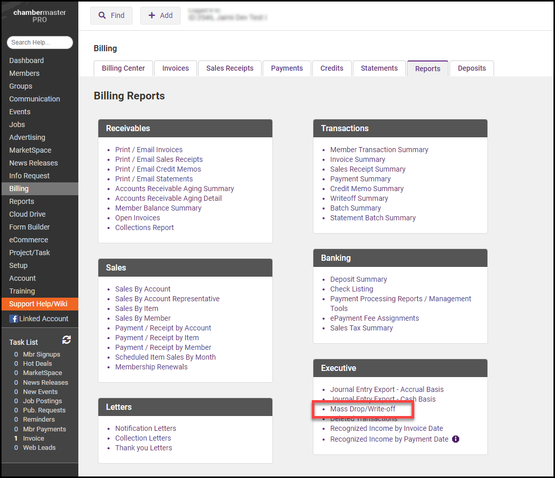 - Click Mass Drop/Write-off in the Executive section. This section is only available to staff with Administrator permissions.