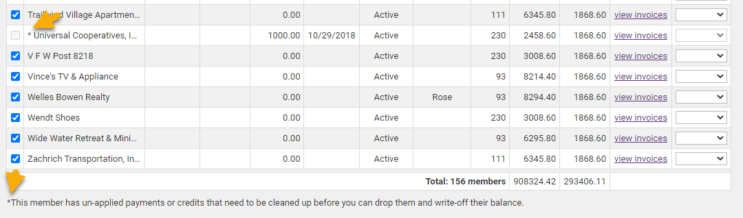 - Make note of any members with an asterisk next to their name. This indicates the member has unapplied payments or credits that need to be addressed before continuing with the drop/write-off process.