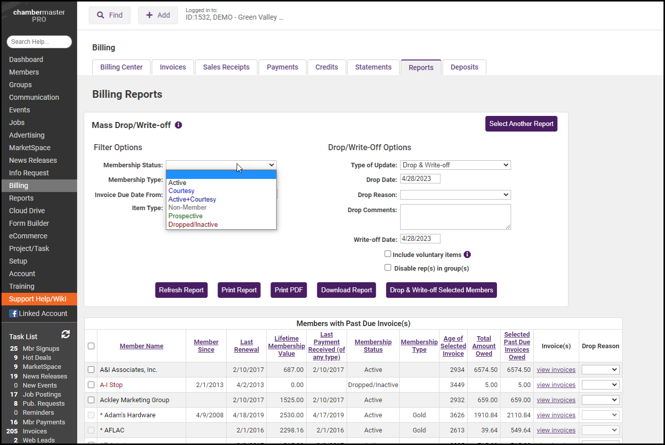 - Select the members you’d like to drop and/or write off by checking the box in front of their names.