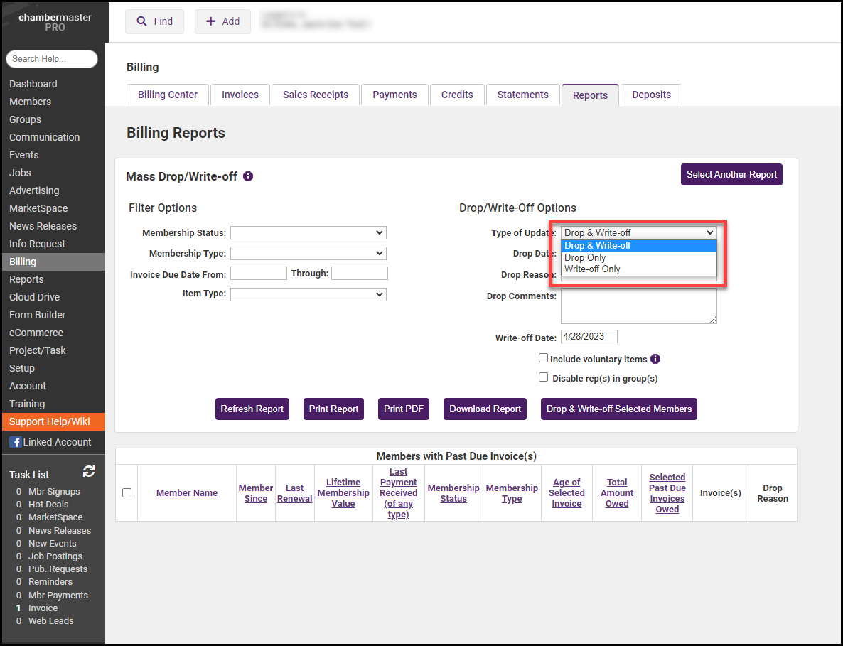 - Type of Update: Drop & Write-off, Drop Only, or Write-off Only.